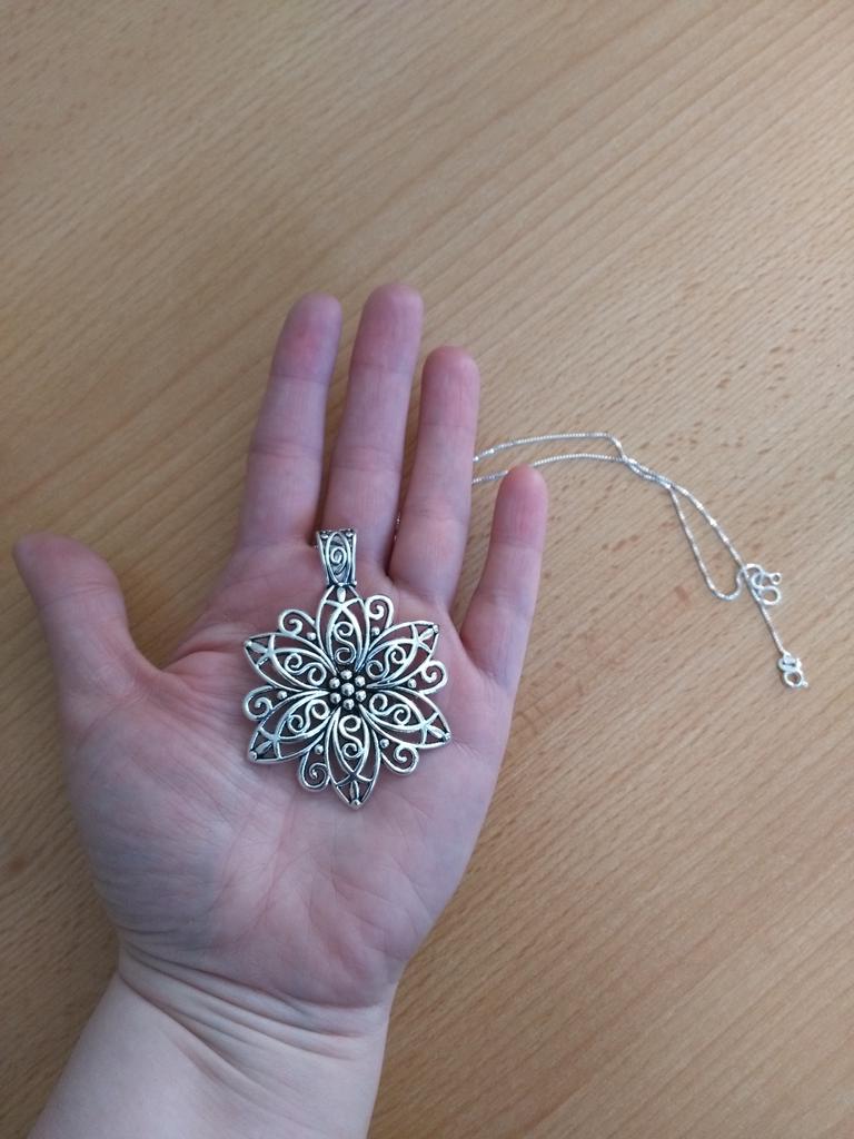 Der Anhänger ist hübsch. Auf der anderen Seite ist die Kette alles pokey (sehr dünn). Zum Glück habe ich noch eine andere Halskette im gleichen Stil mit einer großen Kette 🙂🙂🙂