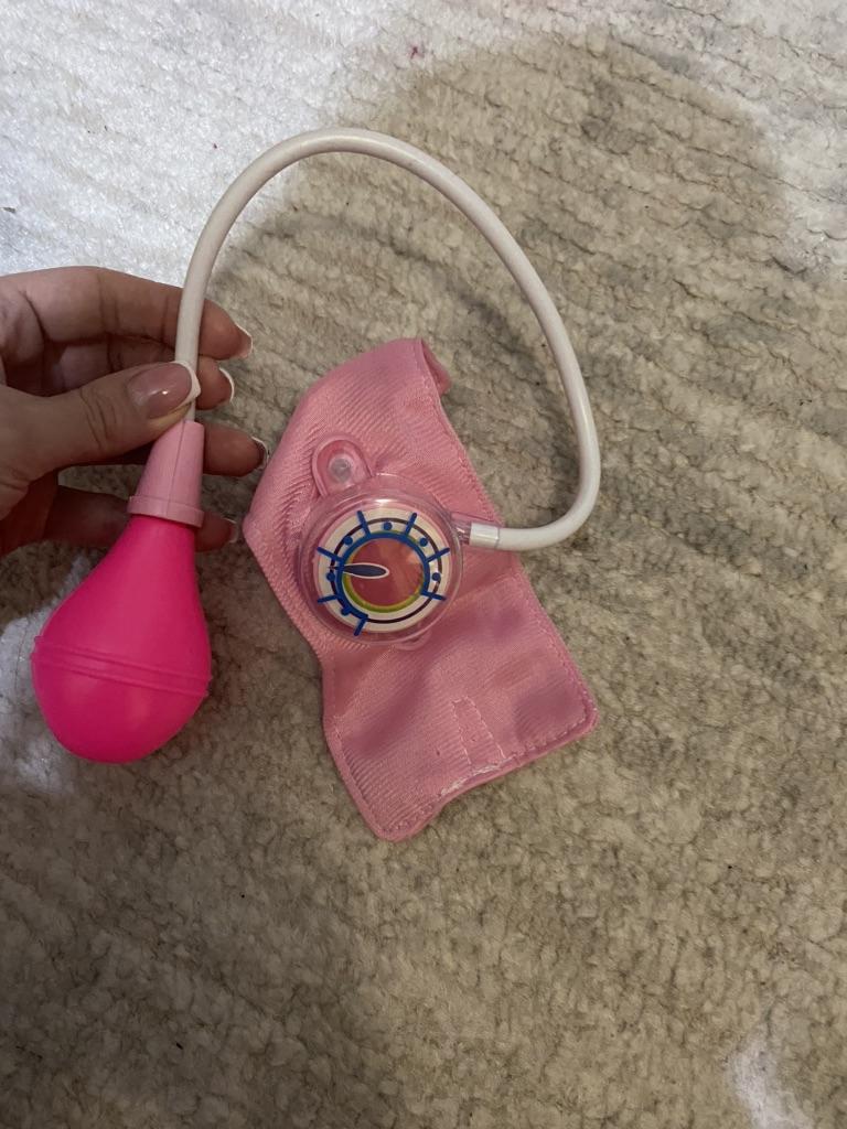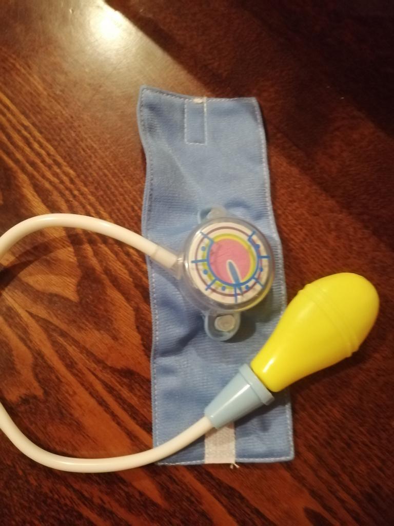 Durch Drücken der Birne dreht sich der Zeiger schneller. Die Manschette ist für ein Kind klein. Das Baby wollte spielen, sie wollte Ärztin werden und meinen Blutdruck messen, aber er ist nicht groß genug, um überhaupt auf dem Unterarm zu enden. Wie auch immer, ganz ok