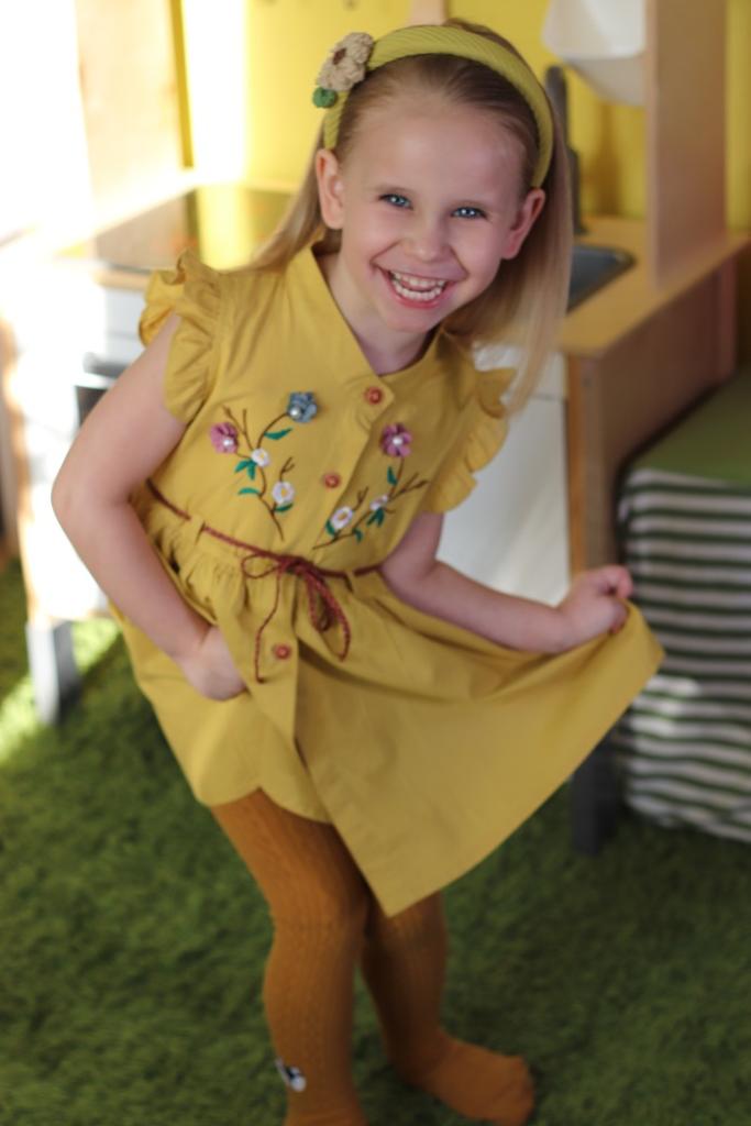 Das Kleid war schön, aber die Blume war oben mit einer Perle aufgeklebt. Sehr riskant für diese Altersgruppe, da es leicht herauskommen und in den Mund gesteckt werden kann. Die Blume sollte zur Sicherheit angenäht werden.