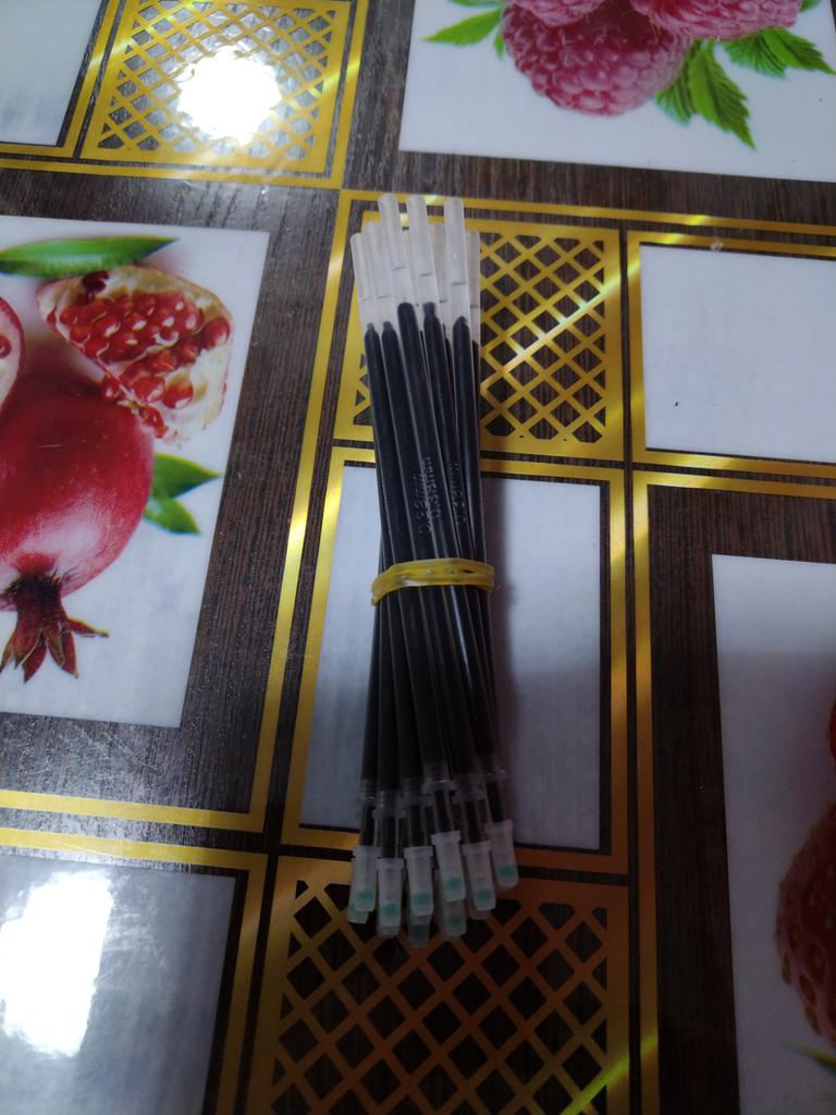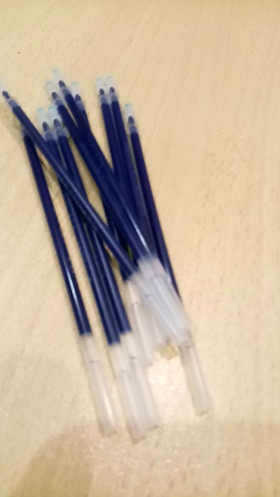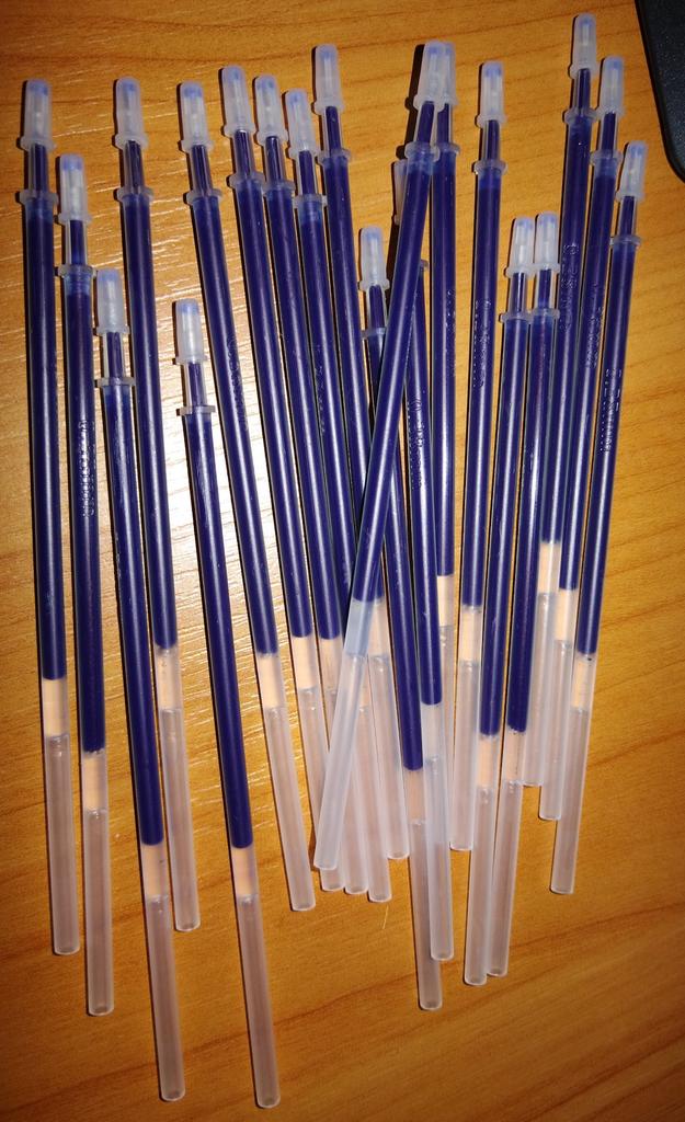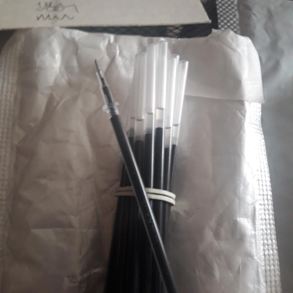 Lieferung ~30 Tage. Sie schreiben ziemlich dünn. Sie schmieren nicht. Etwas kürzer als Stäbe mit einer Dicke von 0,5 mm. Es passt nicht auf alle Stifte, aber wenn die Hände nicht aus dem Arsch sind, dann passen sie auch auf alle Stifte)