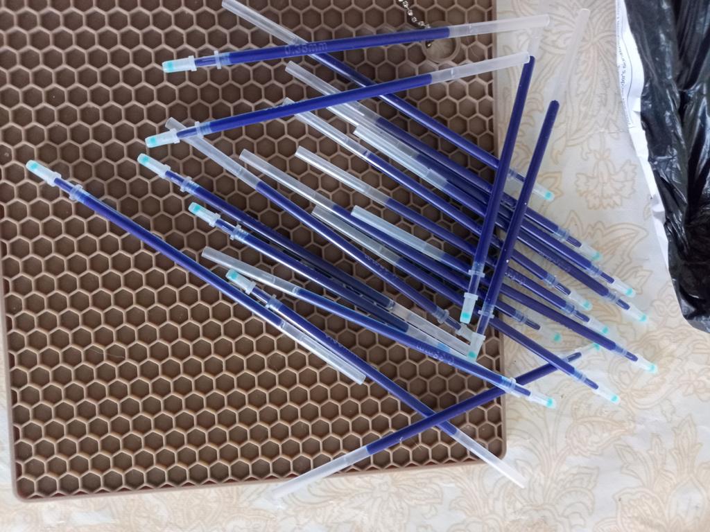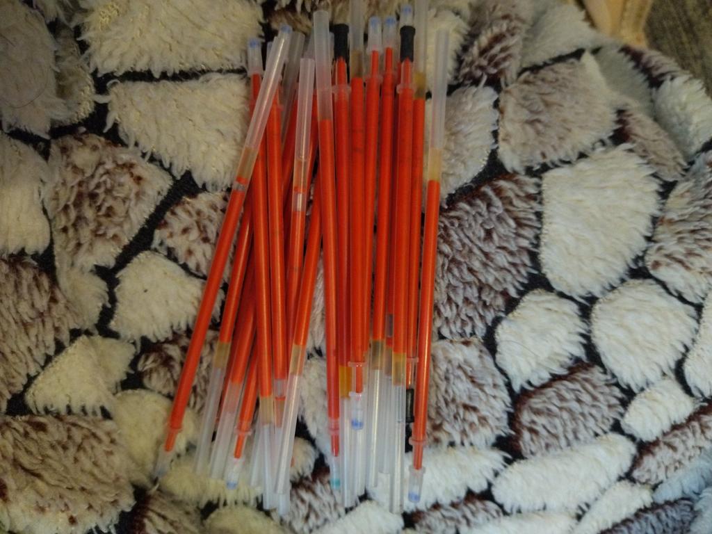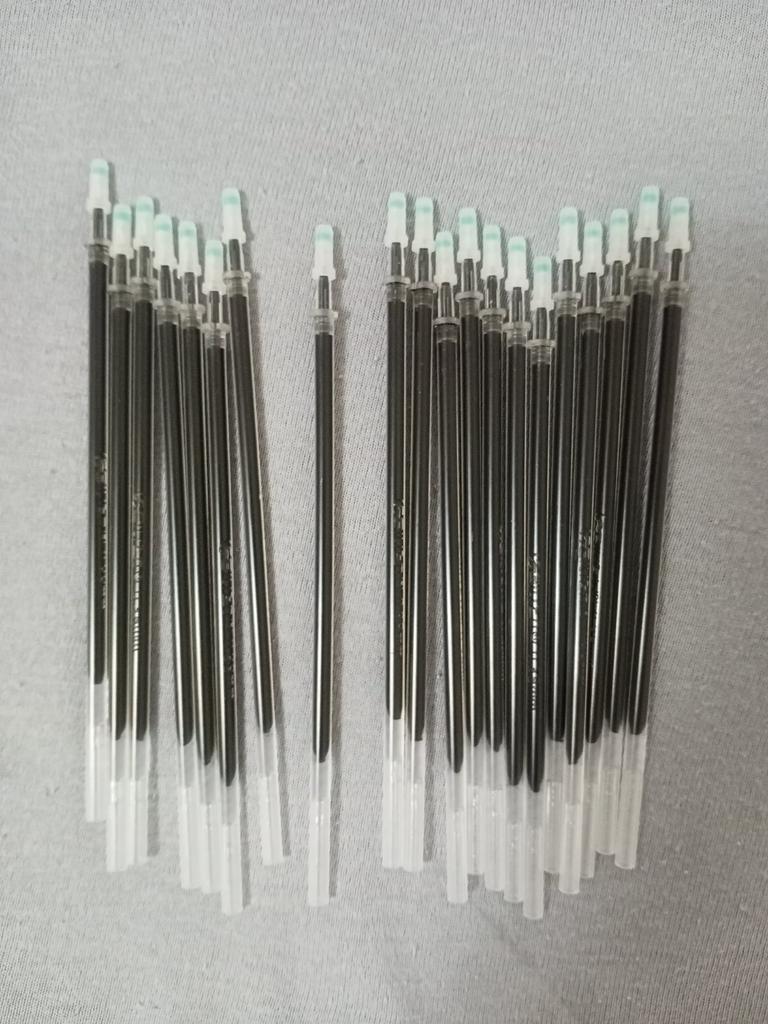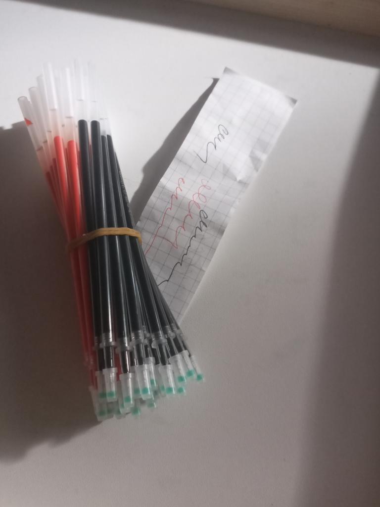 Lieferung ~30 Tage. Sie schreiben ziemlich dünn. Sie schmieren nicht. Etwas kürzer als Stäbe mit einer Dicke von 0,5 mm. Es passt nicht auf alle Stifte, aber wenn die Hände nicht aus dem Arsch sind, dann passen sie auch auf alle Stifte)