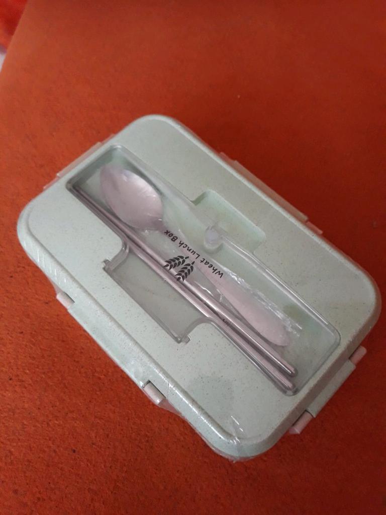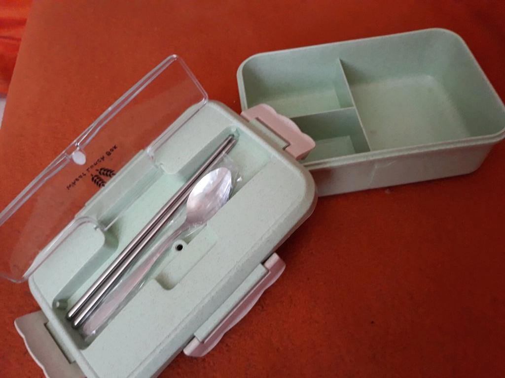 Eine sehr schöne Lunchbox in mintgrün. Das Speisenfach ist dreigeteilt und tief genug, damit sich nichts vermischt. Im Deckel ist ein Besteckfach. Ein Löffel und ein Paar Stäbchen (vermutlich beides Edelstahl) ist im Lieferumfang enthalten. Das Besteckfach bietet aber auch genug Platz für Messer und Gabel. Die Maße sind 22 * 15 * 7 cm, damit völlig ausreichend. Nach Angaben des Verkäufers ist die Lunchbox mikrowellengeeignet, wurde aber noch nicht getestet. Sehr zufrieden.
