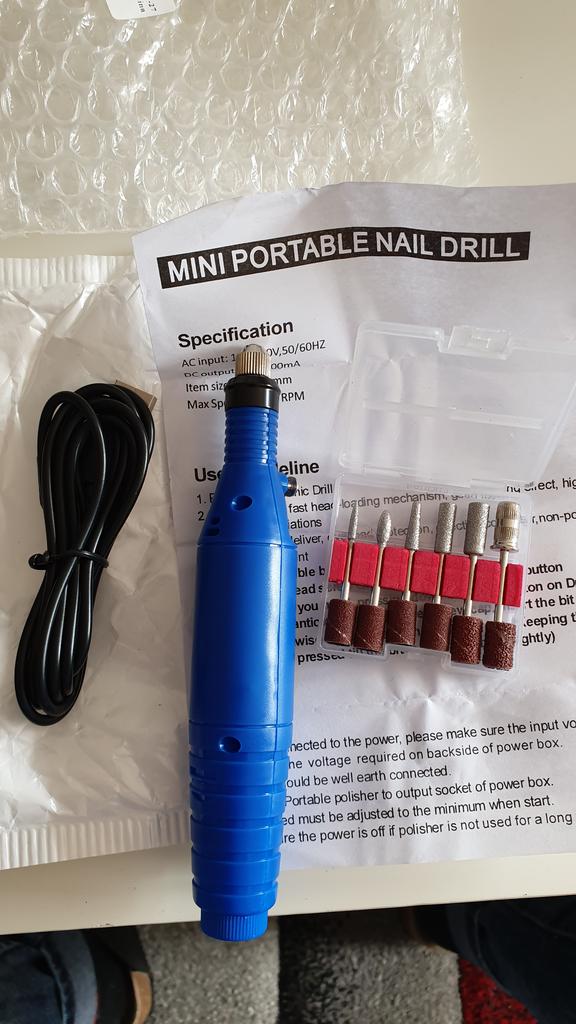 ⭐⭐⭐⭐⭐ Die elektrische Nagelfeile ist nach 2 Wochen, gut verpackt und unbeschädigt, bei mir angekommen. Die Nagelfeile ist sehr gut verarbeitet und hat ein angenehmes Eigengewicht. Sie benötigt Strom aus der Steckdose da sie keinen Akku besitzt. Das USB-Kabel wird mitgeliefert und hat eine Länge von von 150 cm. Der Netzstecker ist nicht im Set. Ein Feilen-Set wird in einer schönen und stabilen Plastikbox mitgeliefert. (Siehe Foto) Das Gerät hat einen starken Motor. Man kann die Leistung mit dem On / Off - Schalter einstellen. Dazu hat das Gerät einen Pausenknopf. Die Feilen werden oben hineingesteckt und dann festgeschraubt. Die Feilen eiern dann nicht rum. Ich muss wirklich sagen: Dieses Gerät ist einem teuren Profigerät kaum unterlegen. Diesen Artikel und den Verkäufer empfehle ich sehr gerne weiter. Hinweis: Die Ersatzfeilen und die Nagelfeilen-Rollen können hier bei Joom günstig nachbestellt werden.