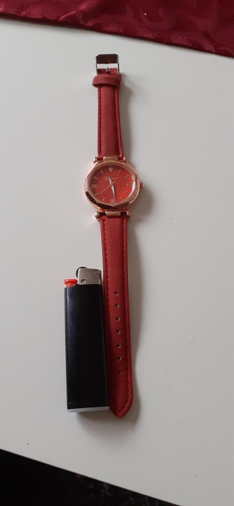 ⭐⭐⭐⭐⭐ Rot / goldene Armbanduhr mit Glitzer Die Bestellung war in 21 Tagen als DHL Paket zugestellt worden und bestens verpackt in einen Luftpolsterumschlag. Zusätzlich war die Ware in Luftpolsterfolie gewickelt. Es handelt sich hierbei um eine hübsche, günstige Armbanduhr mit einem glitzernden Ziffernblatt und im Dunkeln leuchtenden Zeigern. Ich habe die Uhr in der Farbe rot bestellt, es gab aber auch andere Farben zur Auswahl. Momentan gibt es bei diesem Händler nur noch schwarz und braun zur Auswahl, aber ihr könnt gerne in die Vorschläge für ähnliche Artikel schauen, wenn ihr eine andere Farbe sucht. Oben im Ziffernblatt ist ein kleiner weißer Strassstein eingearbeitet. Die Bänder bestehen aus künstlichem Wildleder und haben ausreichend Verstellmöglichkeiten. Die Uhr trägt sich angenehm und sitzt perfekt. Eine Batterie in drin und wird durch einen Abstand im Zahnrad seitlich geschützt. Die Uhr funktioniert einwandfrei. Alles ist bestens verarbeitet. Ich konnte keine Mängel oder Fehler entdecken. Die zeigst leichten im Dunkeln, jedoch nicht unglaublich hell. Es ist okay von der Helligkeit. Insgesamt kann man für das kleine Geld nicht viel falsch machen. Ich bin sehr zufrieden mit Produkt und Verkäufer und empfehle beides sehr gerne weiter.