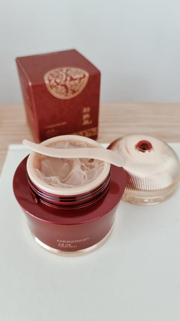Inhaltsstoffe: Schlammpilzextrakt, gereinigtes Wasser, Cyclopentasiloxan, Butylenglycol, Glycerin, PEG-10-Dimethicon, Cetylethylhexanoat, Dimethicon, hydriertes Poly(C6-14-Olefin), PEG-75, Pentylenglycol, Niacinamid, Glycerylbehenat/Eicosadioat, Shea Butter, Chlorella vulgaris-Extrakt, Queensland-Nussöl, Kakaosamen-Extrakt, Carnaubawachs, roter Ginseng-Extrakt, weißer Reisblüten-Extrakt, Malve-Extrakt, Chrysanthemen-Extrakt-Extrakt, Cornus officinalis-Frucht-Extrakt, Thymian-Extrakt, Geweih-Extrakt, Sonnenblumenkern-Öl, Candida bombicola /Glucose/Methyllactat-Fermentationsprodukt, wasserlösliches Kollagen, Macadamiasamenöl, Natriumchlorid, Disteadimoniumhectorit, hydriertes Rizinusölisostearat, Caprylylglykol, Glucose, Fructooligosaccharid, Fructose, Glycerylacrylat/Acrylsäure-Copolymer, Dimethicone/Vinyldimethicone Crosspolymer, 1 ,2-Hexandiol, Dextrin, Bienenwachs, Adenosin, Natriumphytat, Ceramid NP, Phytosphingosin, Ethylhexylglycerin, Polyglyceryl-10-Stear ate, Natriumstearoylglutamat, Xanthangummi, Cetearylalkohol, Phenoxyethanol, Duftstoff, Benzylsalicylat, Alpha-Isomethylionon, Citronellol, Geraniol, Linalool, Limonen, Hydroxycitronellal, Hexylcinnamal