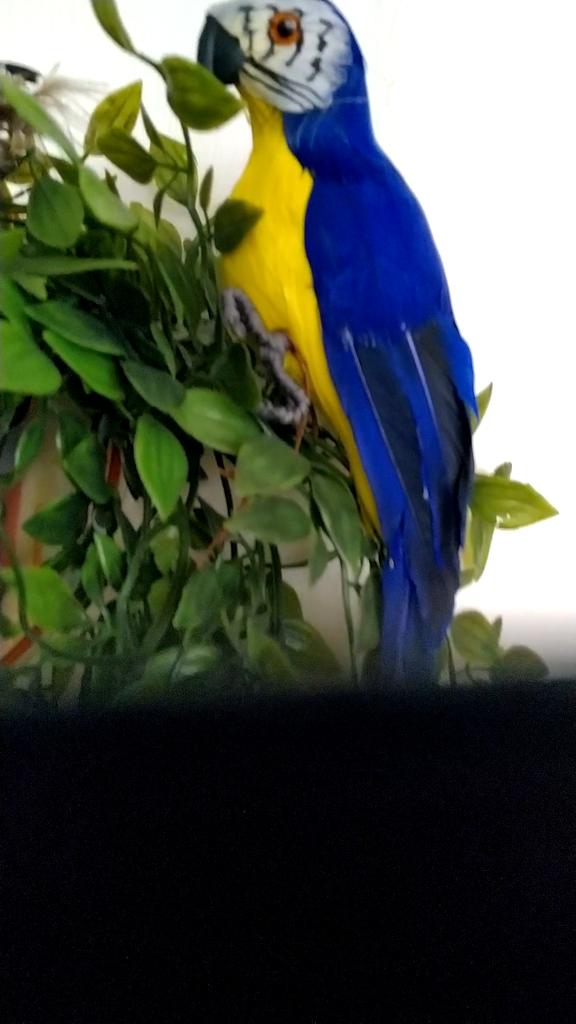 Schöner blauer Papagei, er nahm direkt auf meiner Pflanze Platz, hat ein blaues Gefieder mit einem gelben Bauch, sieht super aus, schön zu empfehlen
