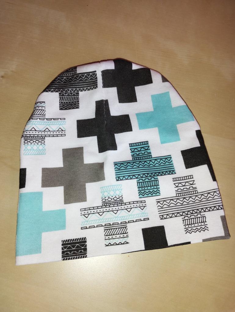 Die 2-Lagen-Mütze, aber immer noch dünn. Oma. Das Ornament passt