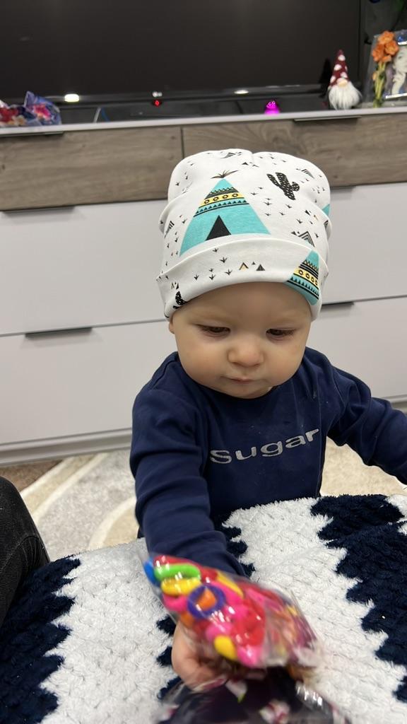 Schöner Hut. Dehnt sich gut aus. Fäden stehen nicht ab. Für unser Alter ist 1,5 etwas zu groß. Aber ich sehe es nicht als Problem. Es wird freier.