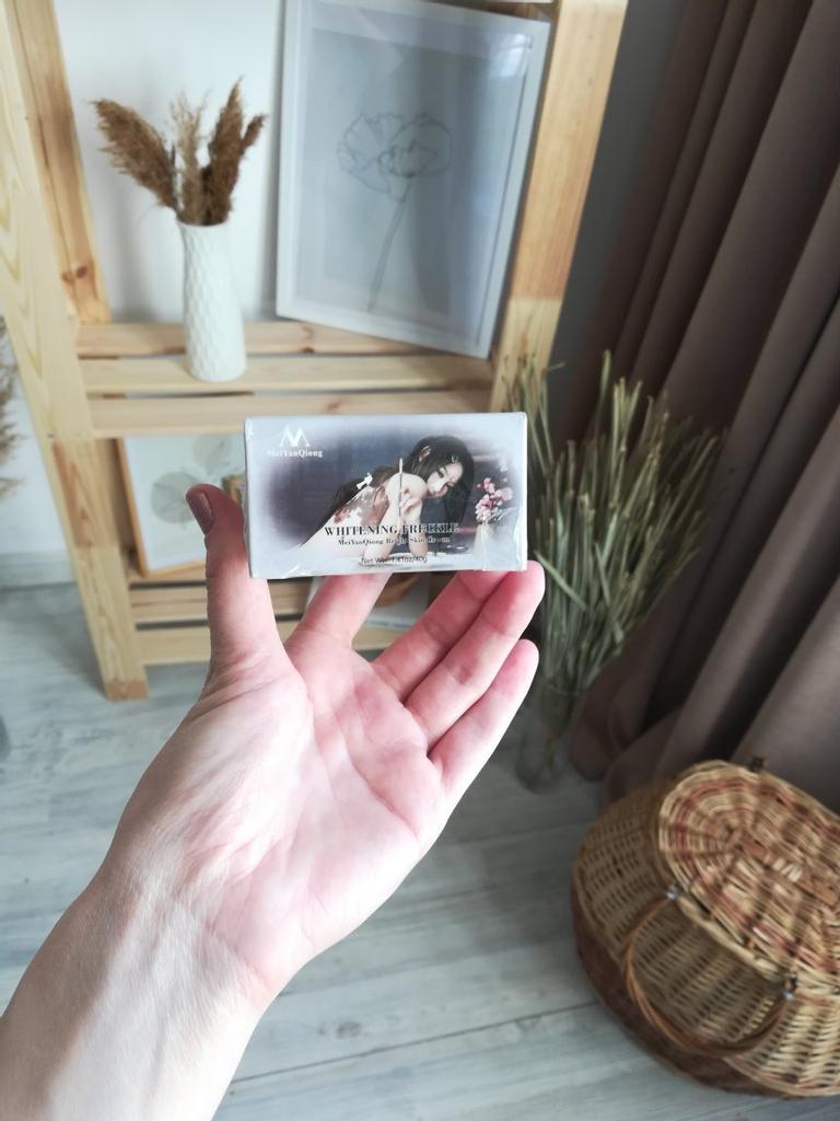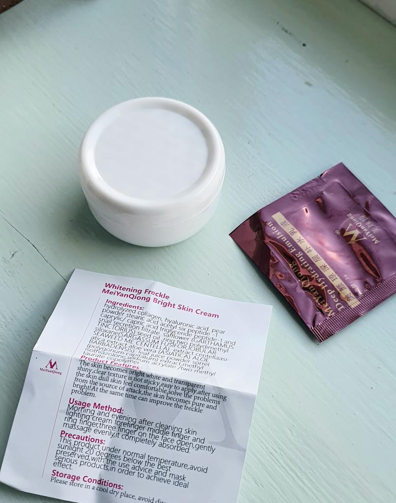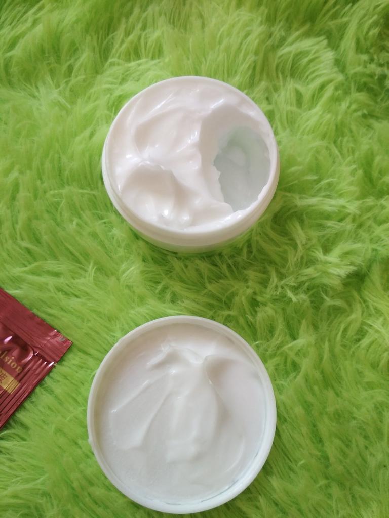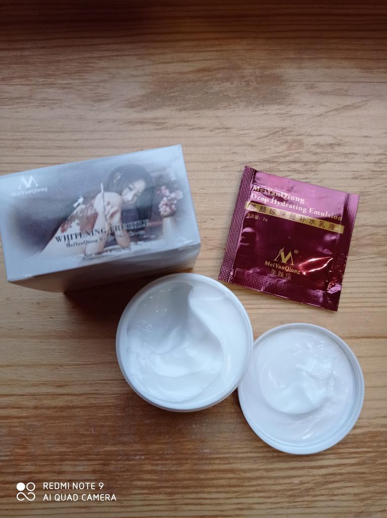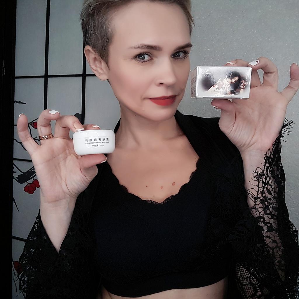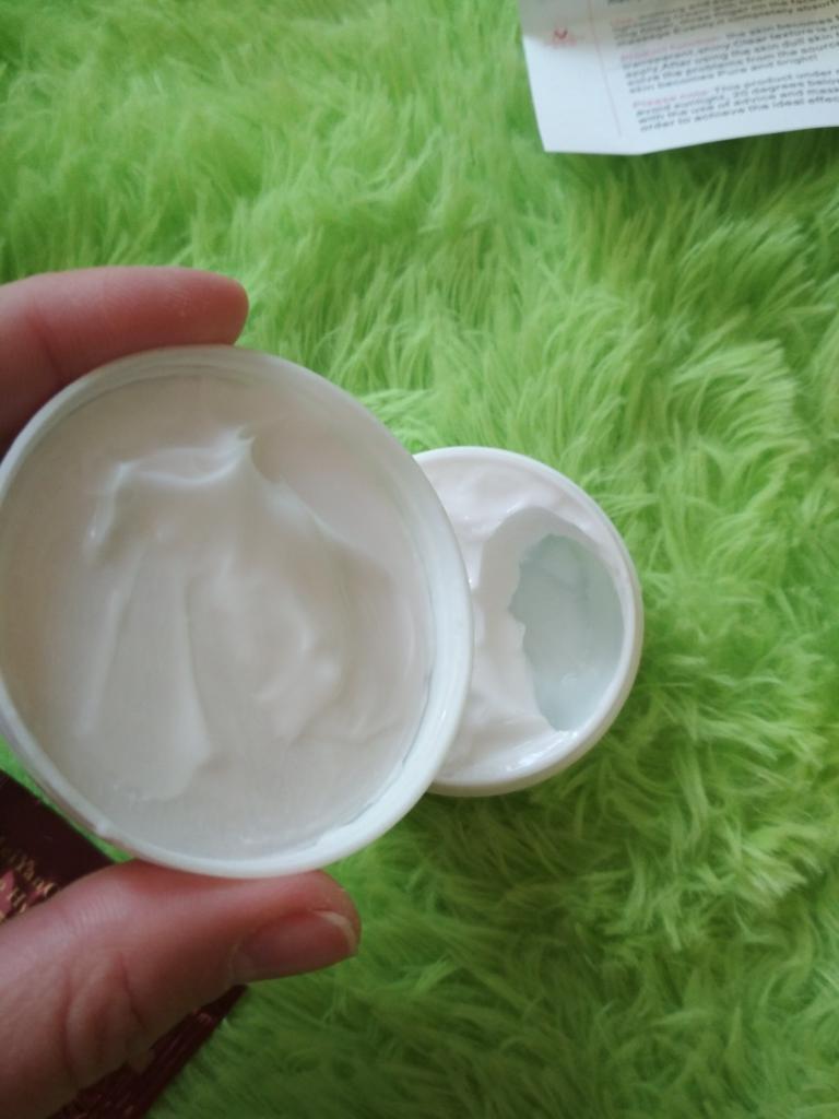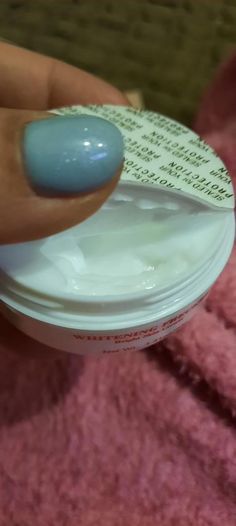 Die Creme ist klein (auf dem Foto im Vergleich zum Sampler zu sehen), aber sie hält lange, ich mochte das Aroma, auch die Konsistenz, die Haut ist mit Feuchtigkeit versorgt und weich, und es gibt keinen öligen Glanz, was erfreulich ist)) Zum Bleaching kann ich noch nichts sagen, da ich erst damit angefangen habe. Ich wünsche allen eine erfolgreiche Wahl 😊