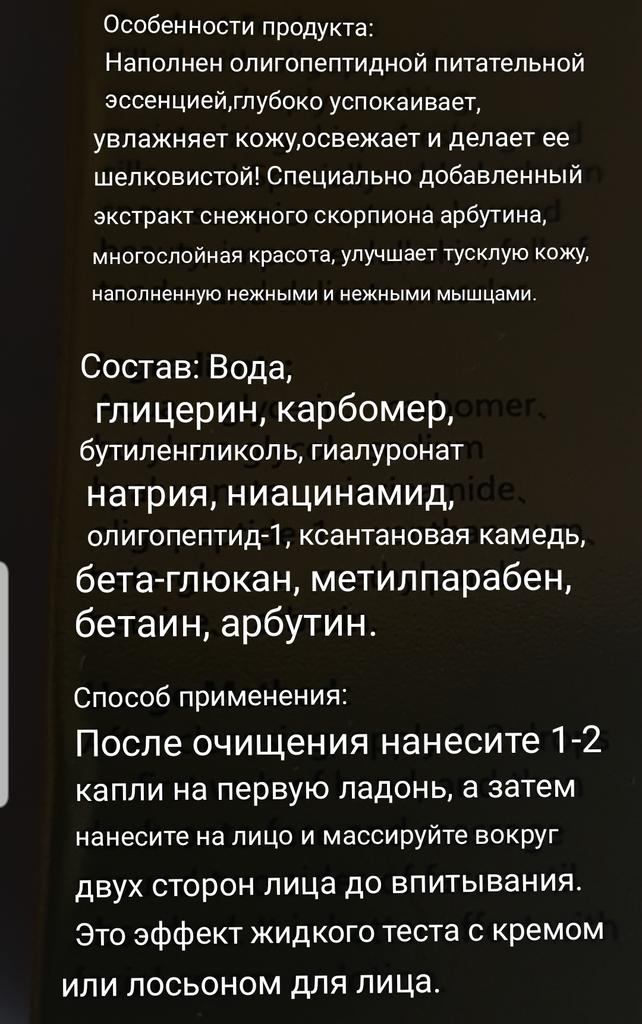 aqua, glycerin, carbomer, butylene glycol, sodium hyaluronate, niacinamide, oligopeptide-1, xanthan gum, beta-glucan, methylparaben, betaine, arbutin.