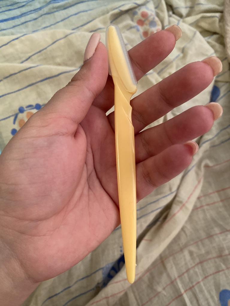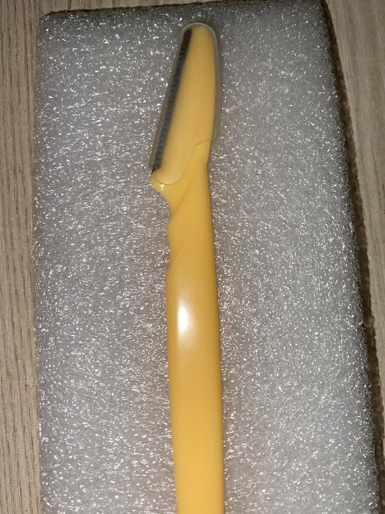 Ich habe die Bestellung erhalten, ein wenig enttäuscht darüber. Die Farbe ist eher orange als gelb, die Klinge ist sehr scharf, man kann sich sogar verletzen... die Haare im Gesicht lassen sich leicht entfernen, das Geräusch beim Auftragen hat uns gut gefallen. 💐🌸