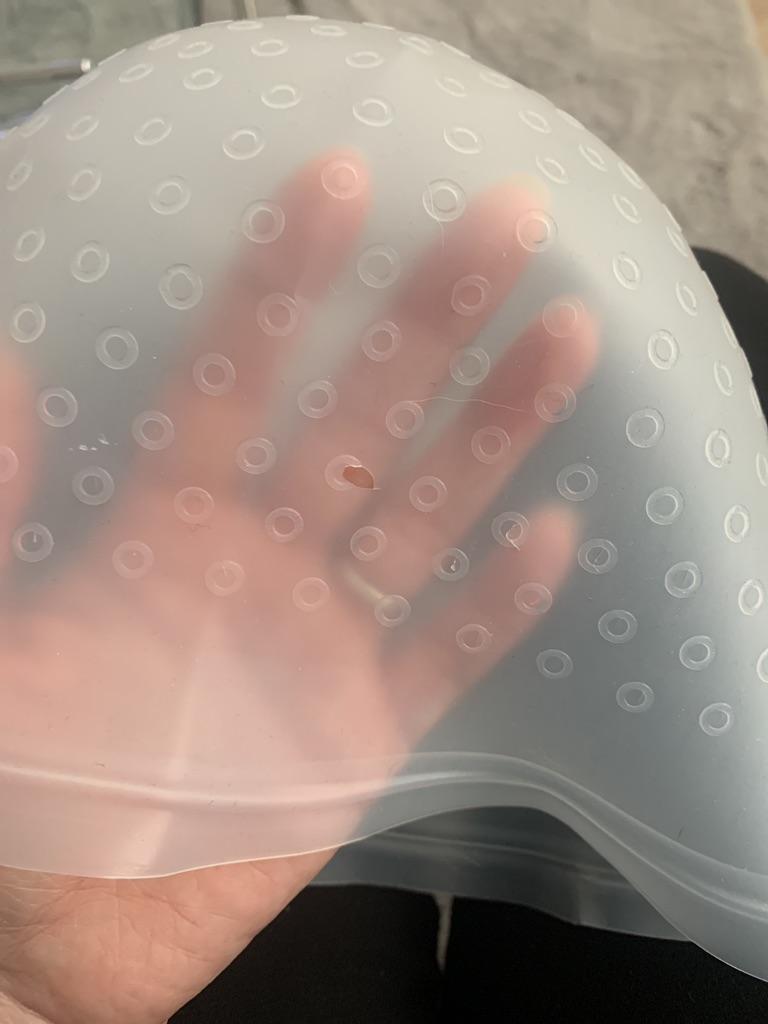 Da keine vorangefertigten Löcher in der Haube sind muss man diese selber machen. Tja, was soll ich sagen... wie man auf dem Foto sieht hielt die Haube dem Halen beim 1. mal (!!!) benutzen nicht stand. So dicke Strähnen wollte ich dann doch nicht haben