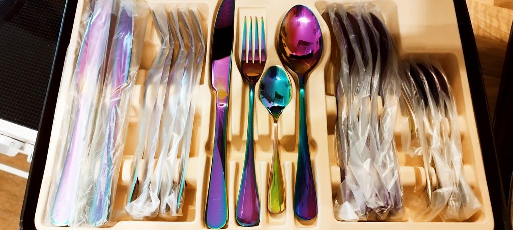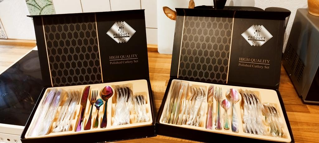 -Versand hat etwas gedauert. -Der Karton ist beschädigt und dadurch unbrauchbar, aber das Besteck nicht. Es ist alles einzeln noch mal mit Folie verpackt,so ist das Besteck auch vor Kratzern geschützt gewesen. Ich bin wirklich begeistert von dem Besteck,die Farbe ist genauso wie auf dem Shopbild. Es scheint eine richtig tolle Qualität zu sein! Ich werde mir nun noch das Rosè Farbene dazu bestellen. Ich habe einen normalen silbernen Löffel daneben gelegt,damit man den Farbunterschied sieht. Update: leider muss ich meine gute Bewertung ändern. Das Besteck war jetzt 1x im Geschirrspüler und rostet direkt. Geht gar nicht! (Siehe letztes Foto)