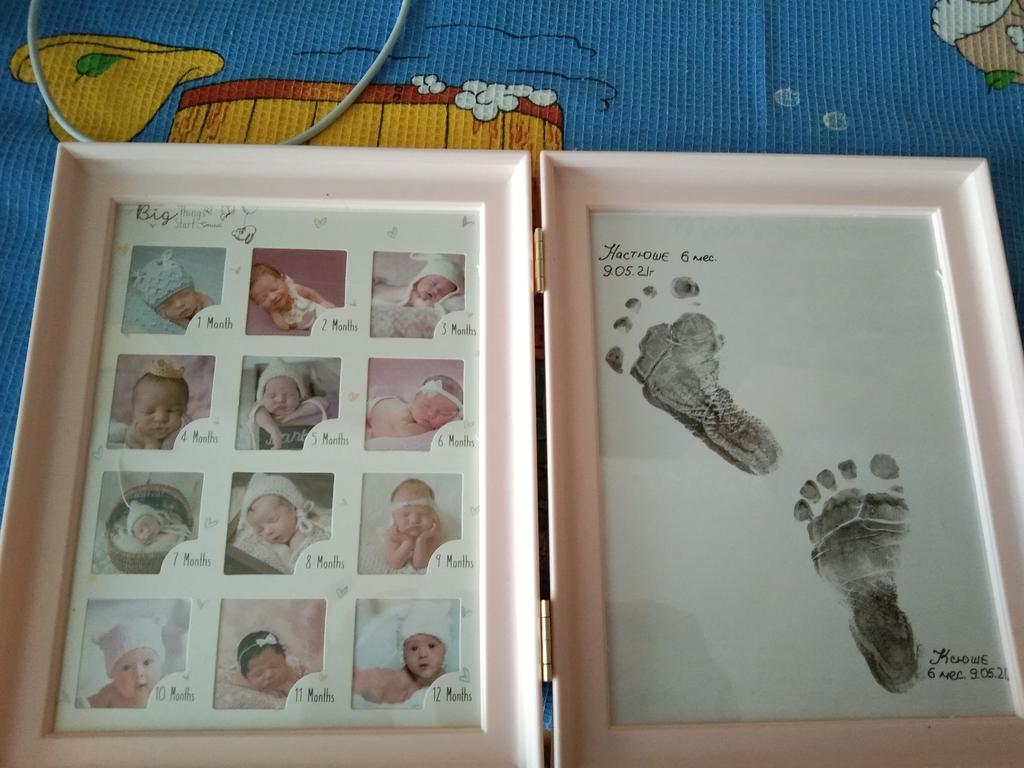 Sehr schöner Souvenirrahmen zu bieten. Die kleinen Fotos sind 3 x 3 cm von 1 Monat bis 12 Monate. Im Inneren befindet sich das Stempelkissen für die Abdrucke. Das Ganze misst offen 36 x 23 cm. Lieferung in 1 Monat.