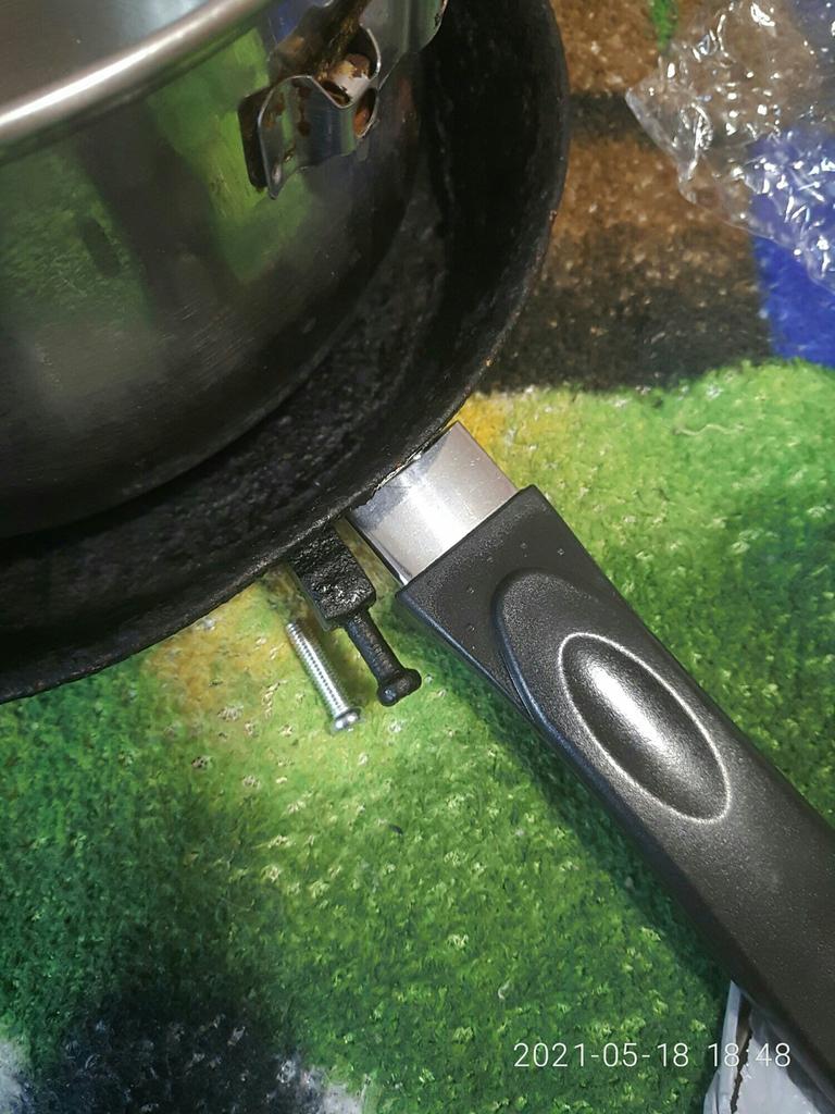 es gibt zwar die Befestigungsschraube jedoch das Gegenstück, um den Griff an der Pfanne zu befestigen, fehlt