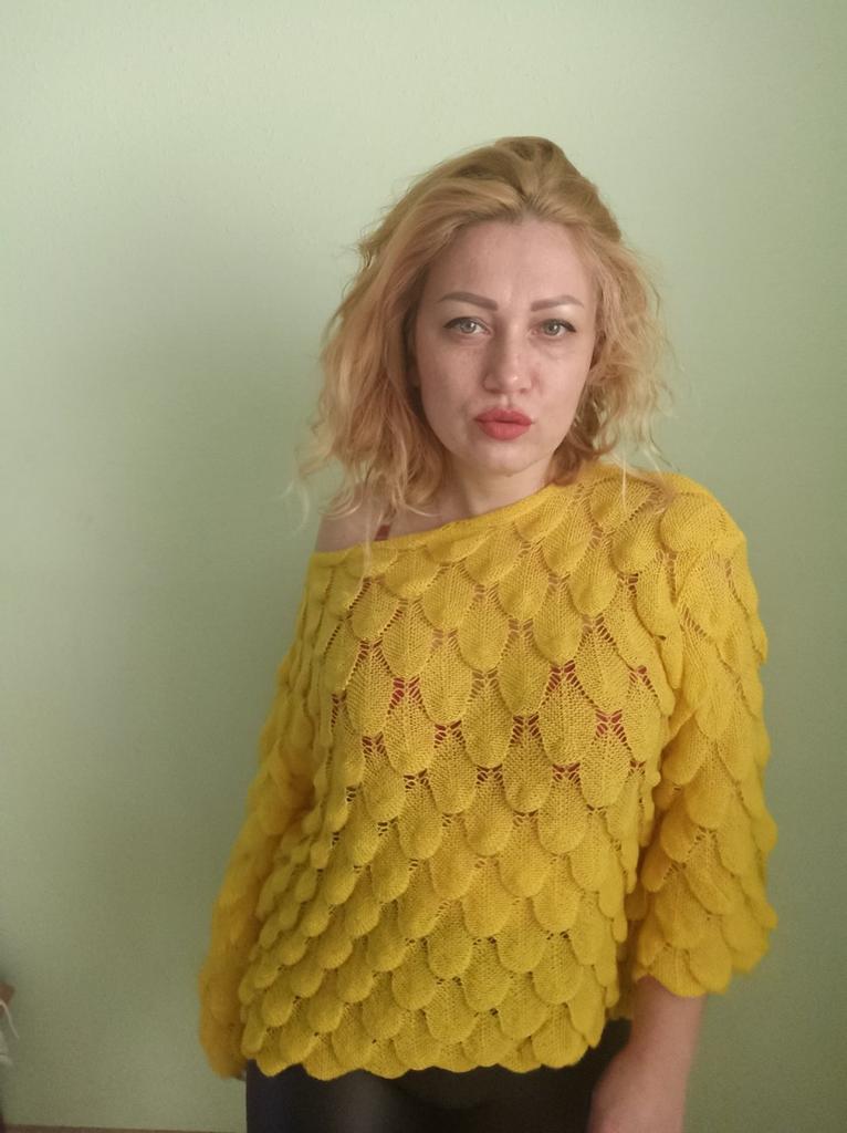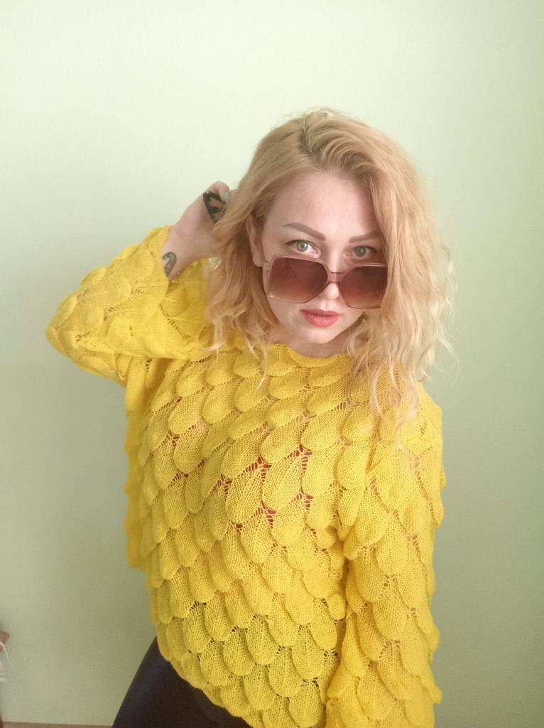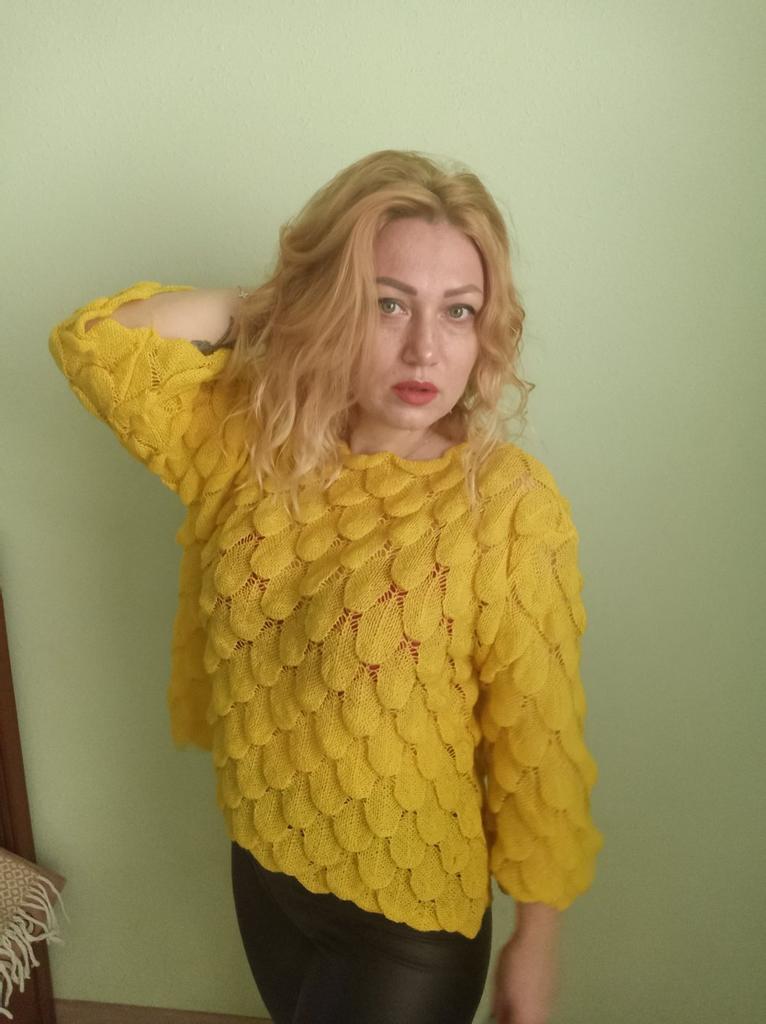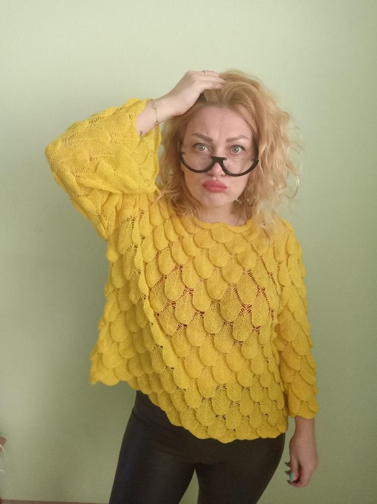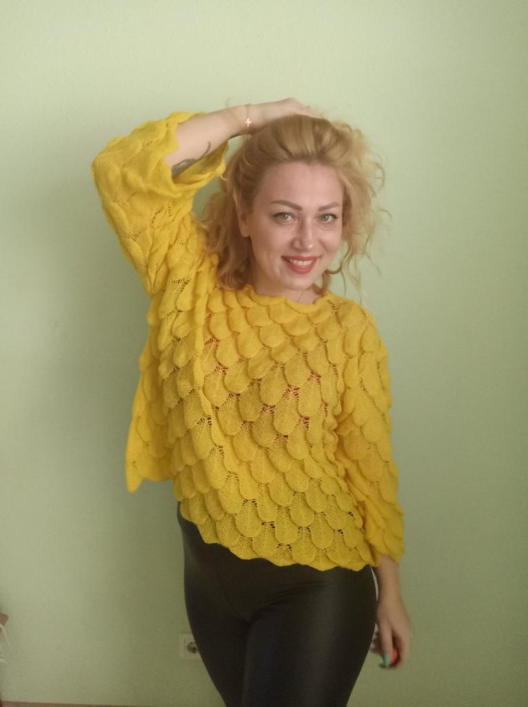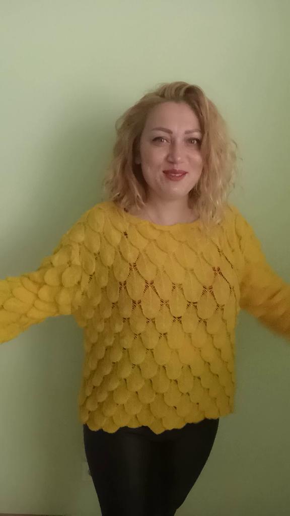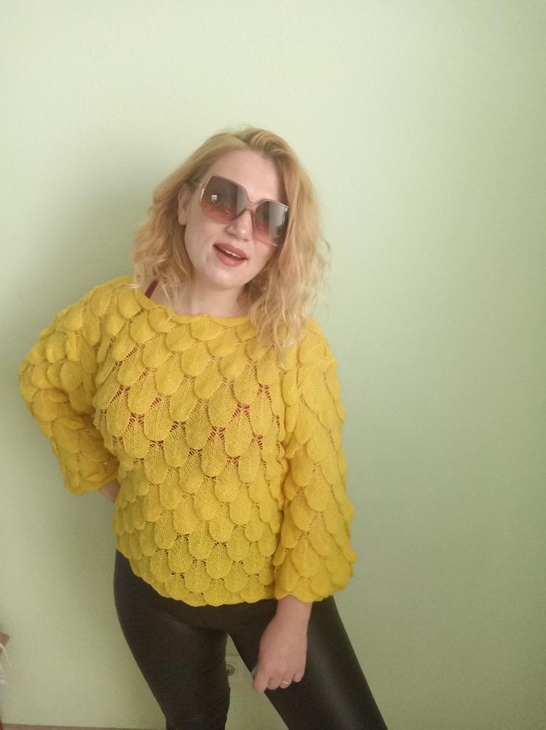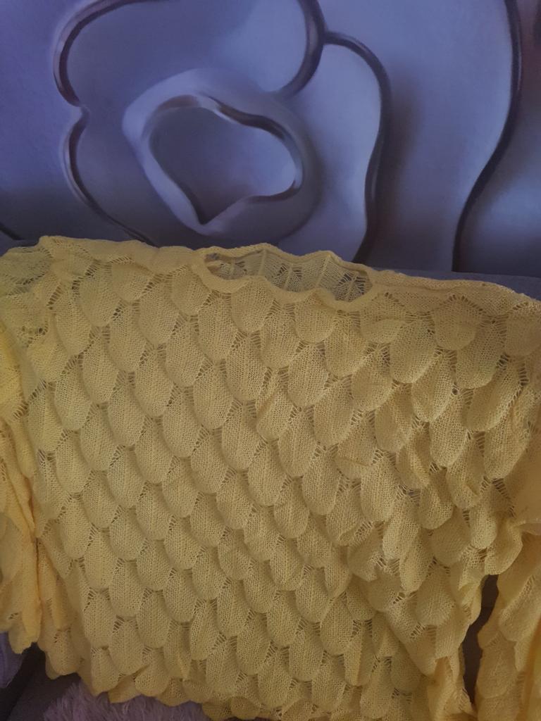 Sehr hübscher kleiner Pullover, leicht über ein Top oder ein Kleid mit dünnen Trägern zu ziehen, da er transparent ist. Andererseits ist die Farbe nicht ganz dieselbe, der Pullover wirkte ginstergelb und es ist weniger hell, weniger blendend, aber das Gelb bleibt hell. Die Form der Ärmel gefällt mir sehr gut. Ich empfehle diesen Artikel 👍