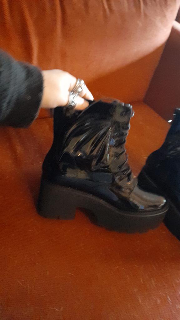 sie riechen ein bisschen nach PVC aber sie sehen schön aus, sie sind ganz schön und sie sind super leicht, eine wirklich schöne Überraschung und superschnelle Lieferung laut App, sie sind noch in Japan oder so und ich habe sie schon super glücklich mit ihnen , schön unter meinen Vampir-Gothic-Kleidern
