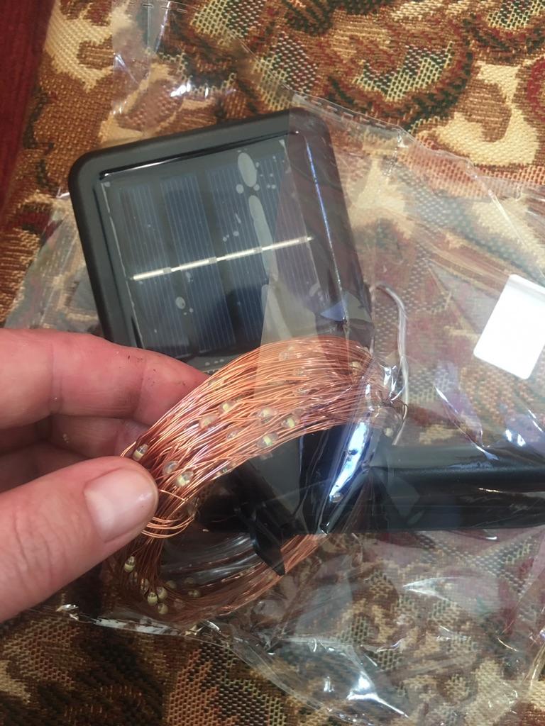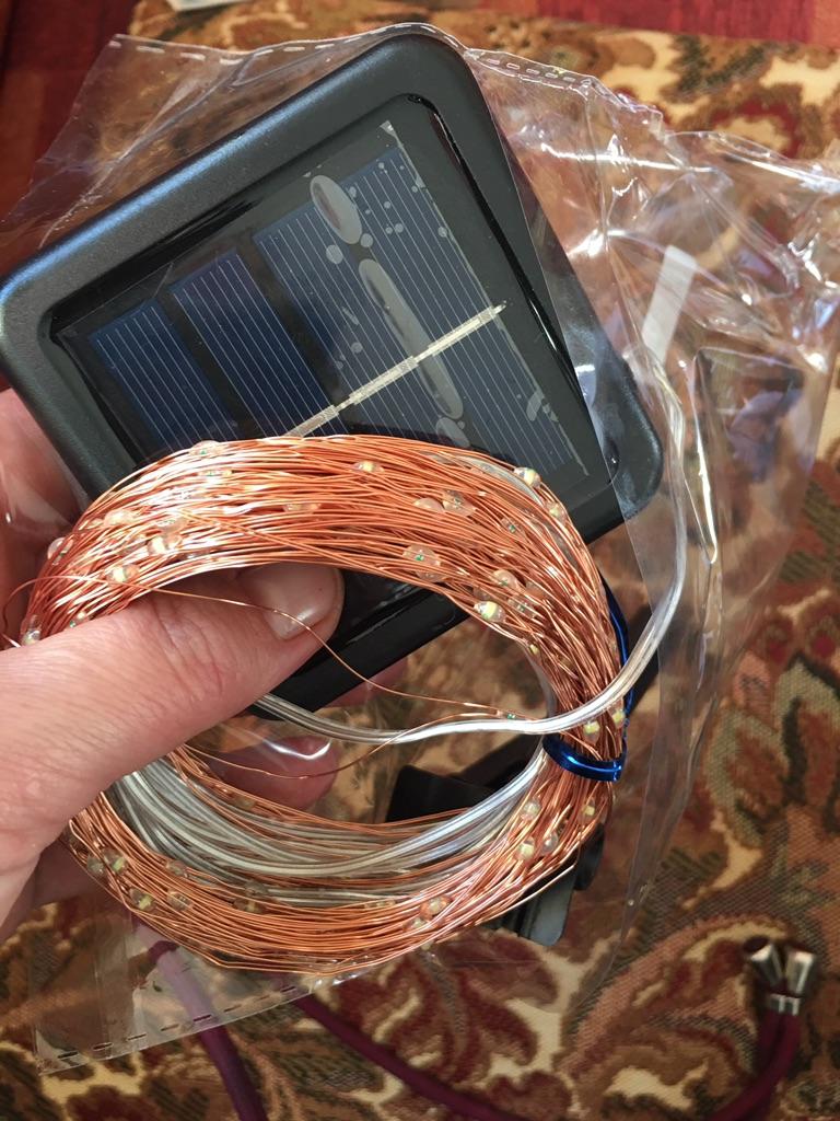 Girlande Spinnennetz, 20 Meter, aufgeladen. Funktioniert im Dunkeln - es gibt einen automatischen Dunkelheitsindikator, der am ersten Abend etwa sechs oder sieben Stunden lang leuchtete. Dann war es bewölkt und es gab nicht genug Licht zum Aufladen. Ein wenig hervorgehoben für die letzten drei Tage, und alle ... warten auf die Sonne