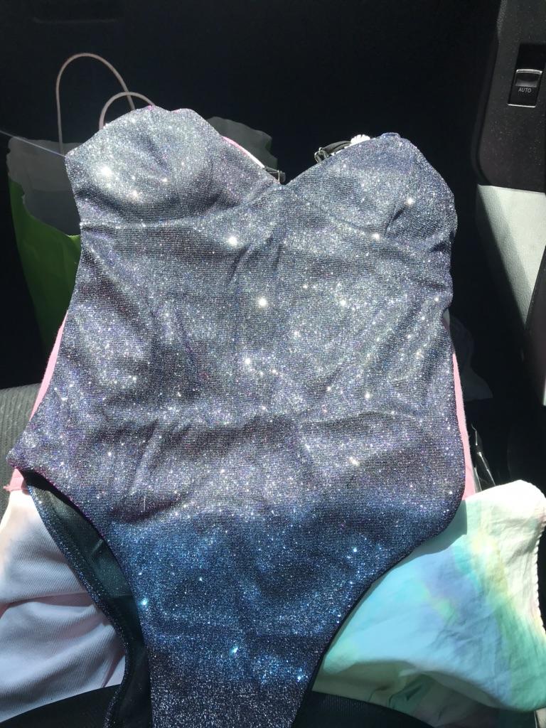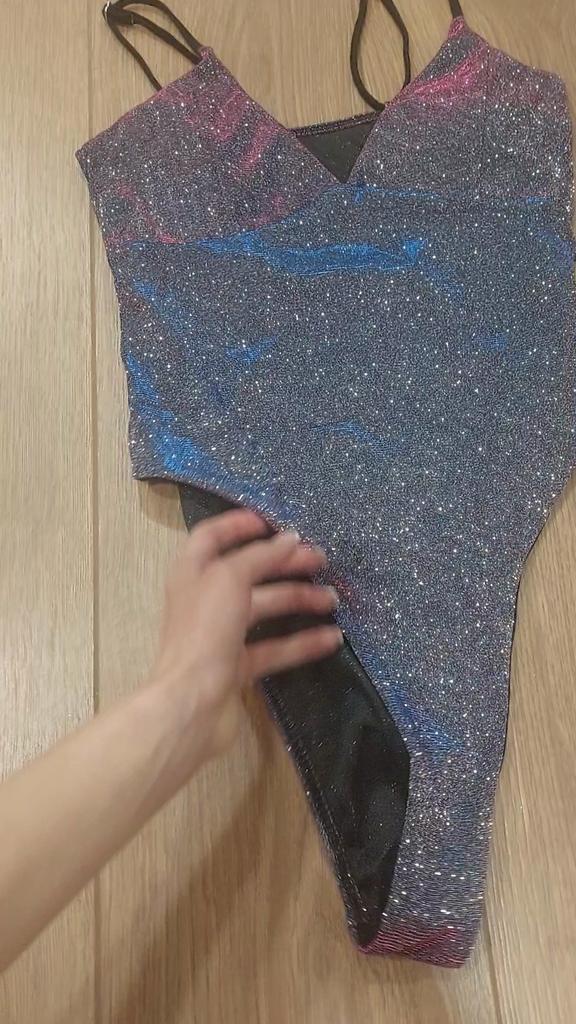 Glitzernder Badeanzug, sehr hübsch!! ✨😍✨ Ich liebe es! ❤️❤️❤️ Material ist super, super gute Qualität. Der Glitzer fällt nicht. Stoff hat Stretch. Es hat abnehmbare Polsterung und verstellbare Schultergurte. Super 😙💖