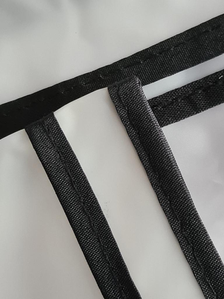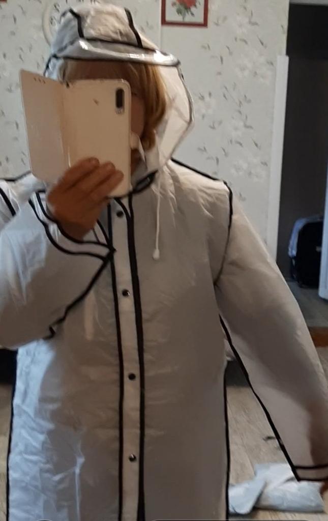 Der Regenmantel ist gut, kam mit einer Abdeckung an. Polyethylen ist dicht, die Nähte sind gesäumt, sodass der Regenmantel teuer aussieht. Es gibt ein transparentes Visier. Entspricht dem Maßraster.