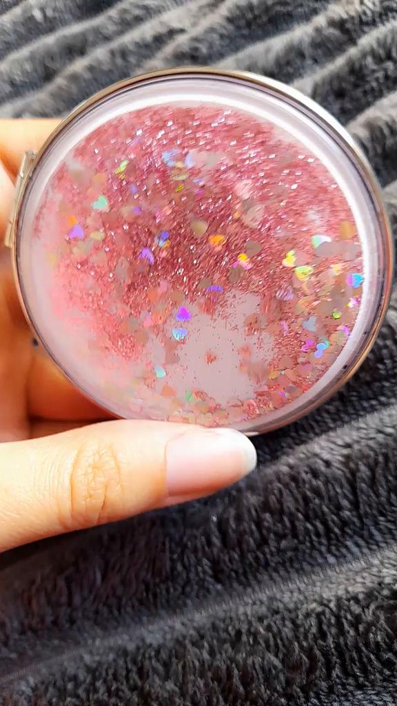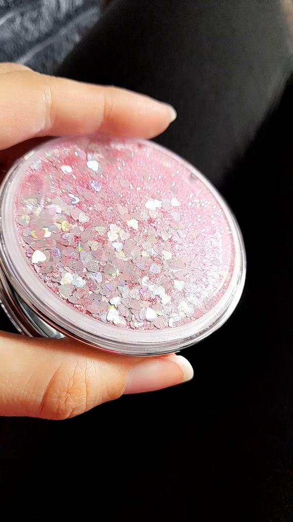 2-Face Mini-Taschen-Make-up-Spiegel, kreativer Kosmetik-Kompaktspiegel mit fließender, glitzernder Sanddosenbeschriftung