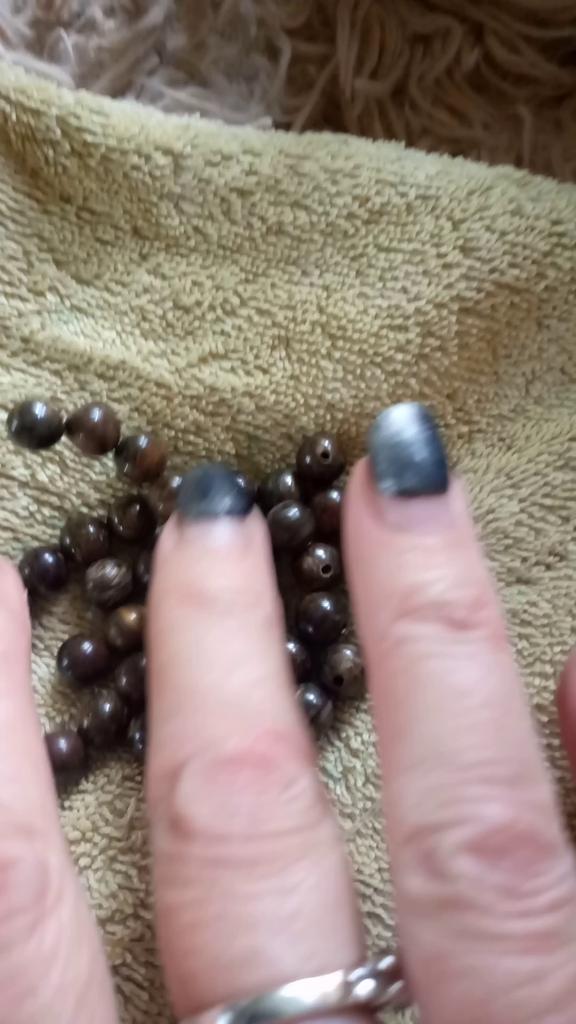 Im Strang 38,5 cm. Dunkle Perlen, stellenweise mit helleren Flecken.