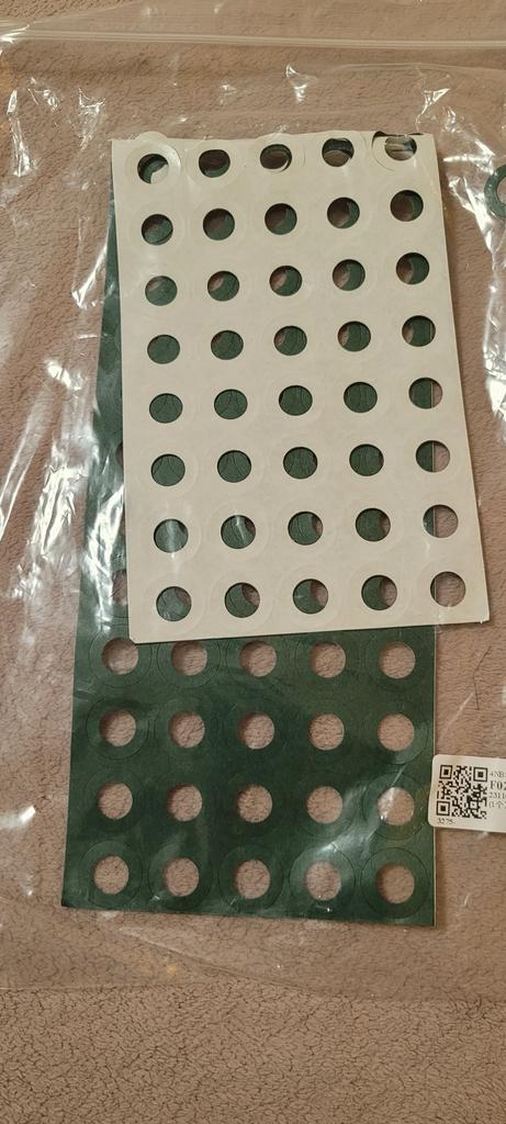 Isolierende Abstandshalter aus Pappe für Batterien von Batterien, auf einer Klebeschicht. Kam in der Mitte verbogen und zerknittert an.