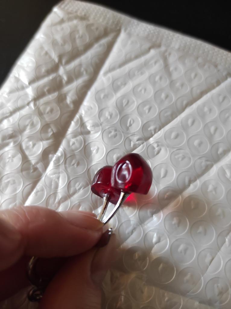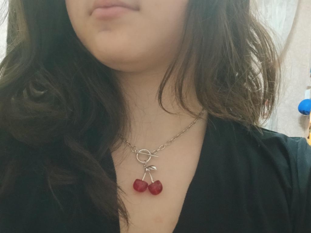 Die Kette ist gut, ich werde sie für einen anderen Anhänger verwenden, denn mit den Kirschen gibt es ein Missverständnis, sie sind irgendwie halb abgeschnitten.