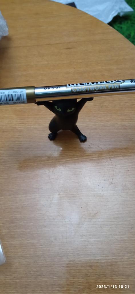 Eine lustige Katze, aber als Stifthalter ist sie schwer zu benutzen. Man kann den Stift nicht schnell und beim ersten Mal auf eine solche Halterung legen. Daher wird sie einfach auf dem Schreibtisch stehen.