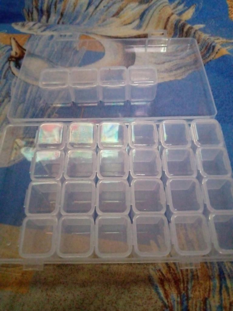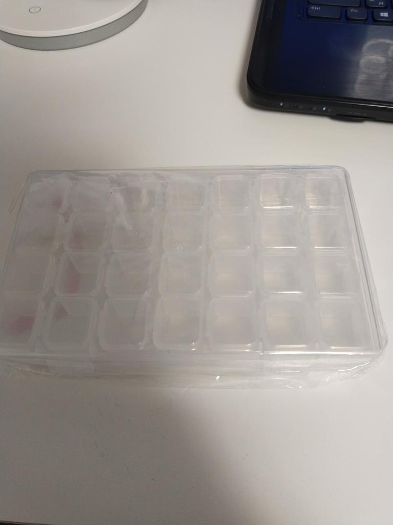 Ein bisschen kleiner als ich dachte, praktisch für einen Monat als Tablette. Diamanten zum Sticken passten, aber einige mussten in mehrere Behälter gegossen werden. Aber im Allgemeinen ist es bequem