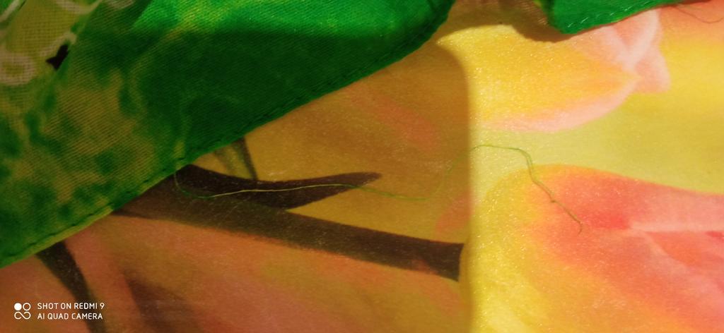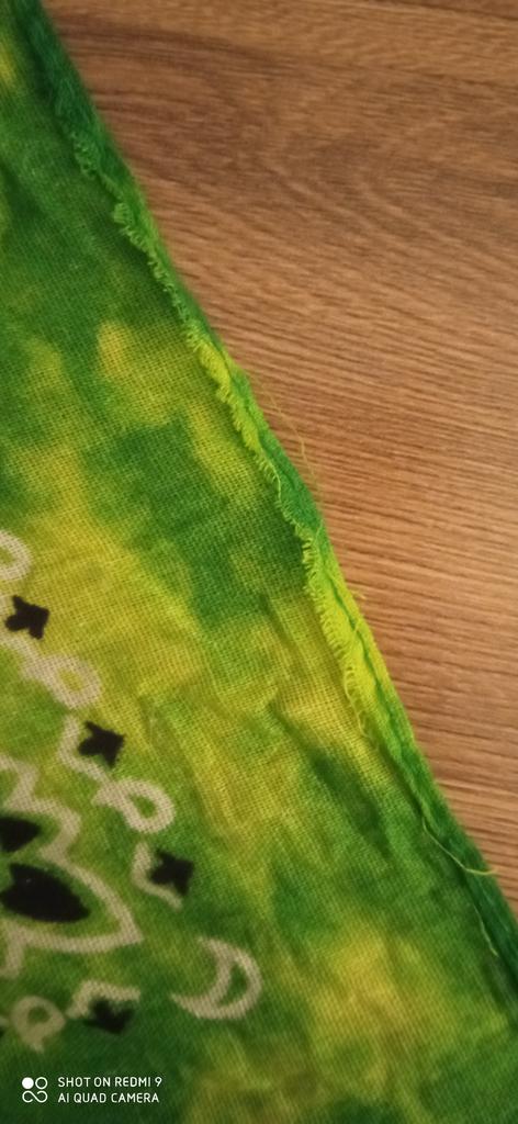 Die Nähte sind sauber. Beim Anprobieren auf dem Kopf scheint es in Ordnung zu sein; die Enden sind lang genug zum Binden. Für den Garten, im Hof ist es nicht schlecht, aber unter Leute braucht man eine andere Frisur und ein anderes Kleid.