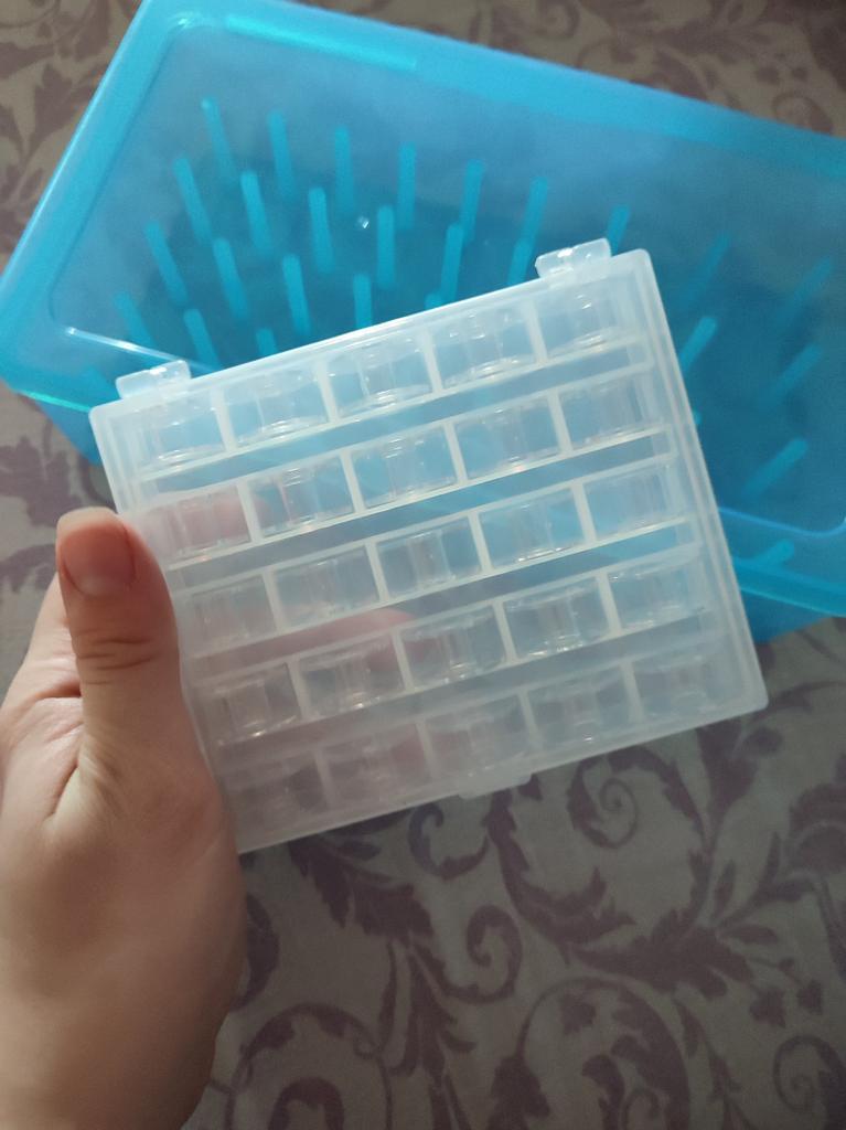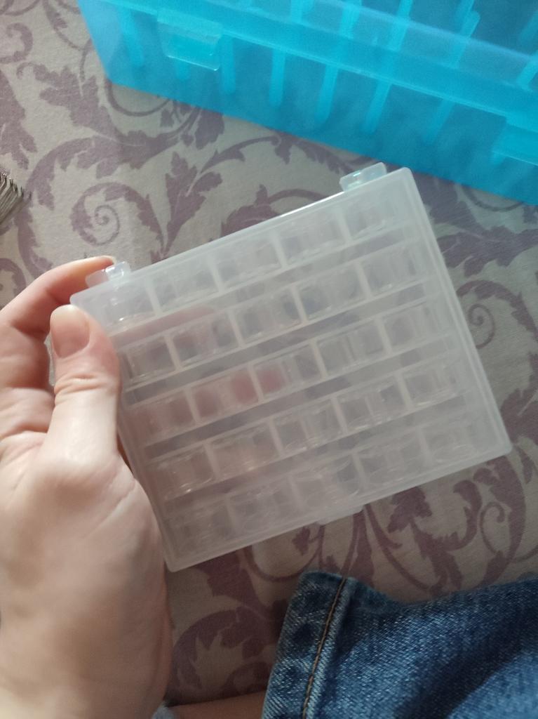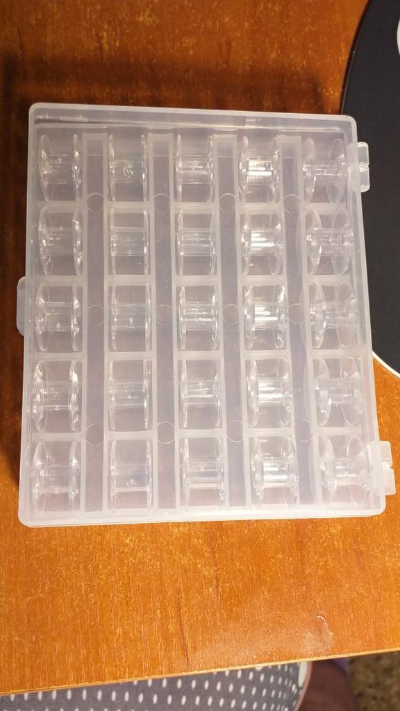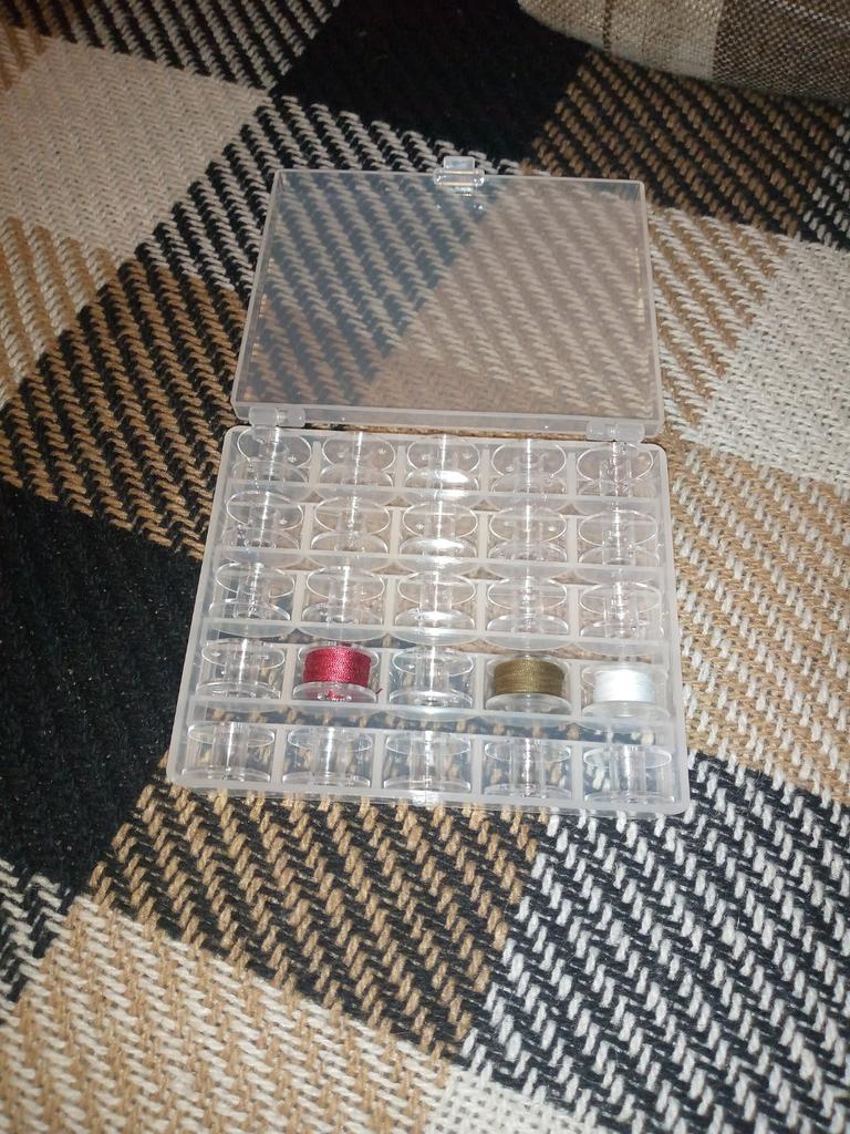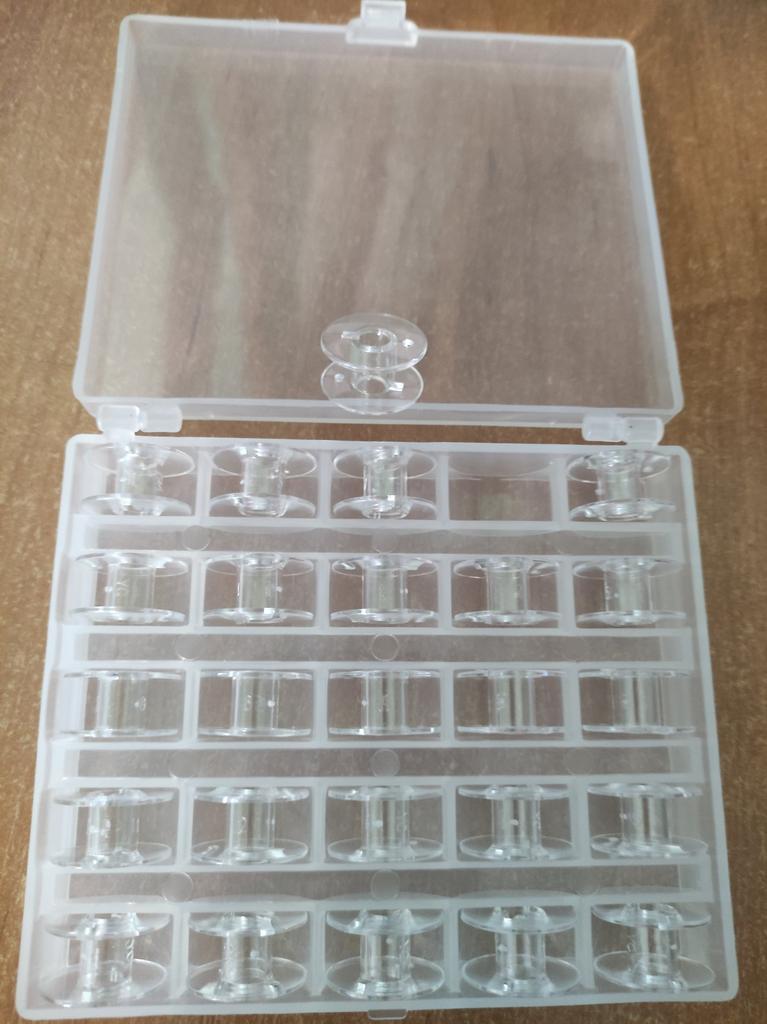 Sehr praktischer Spulenkasten. Die Farbe des Fadens ist sichtbar.