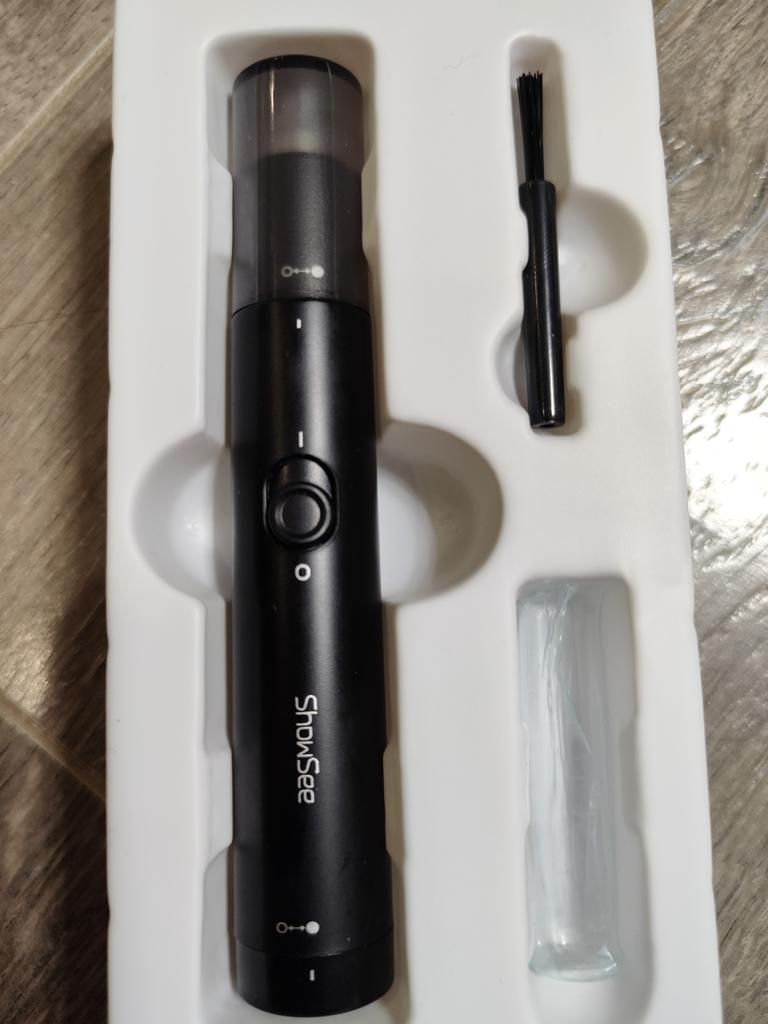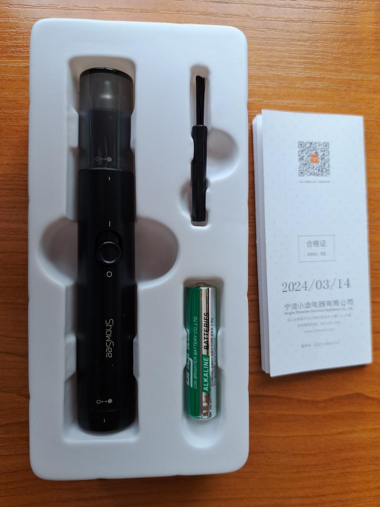 Gut verpackt, nicht geöffnet. Das Set enthält das Gerät selbst, eine Bürste zum Reinigen und eine AAA-Batterie. Funktioniert. Xiaomi-Aufschriften sind nirgends zu sehen...