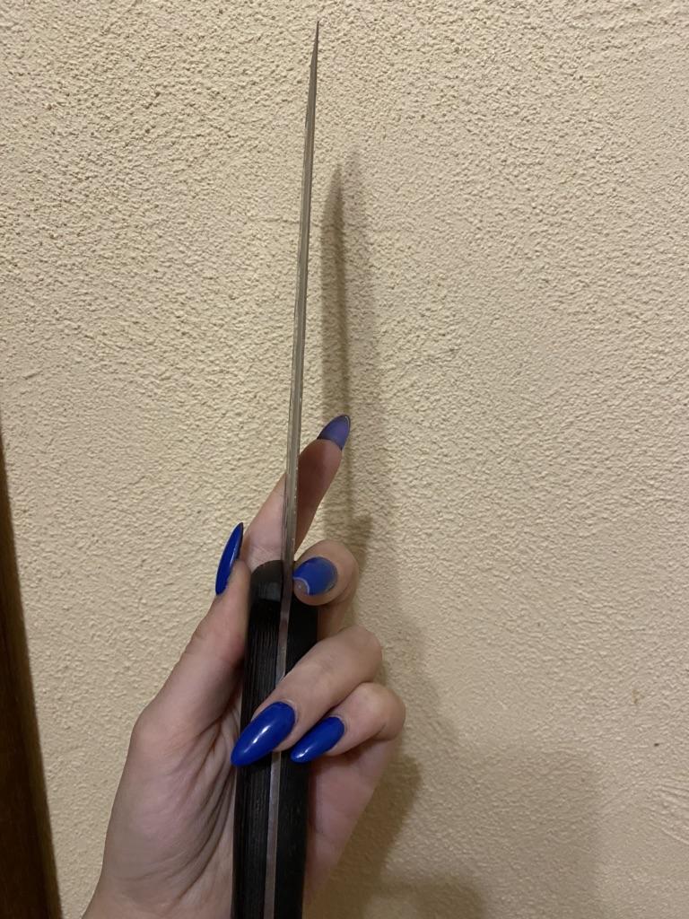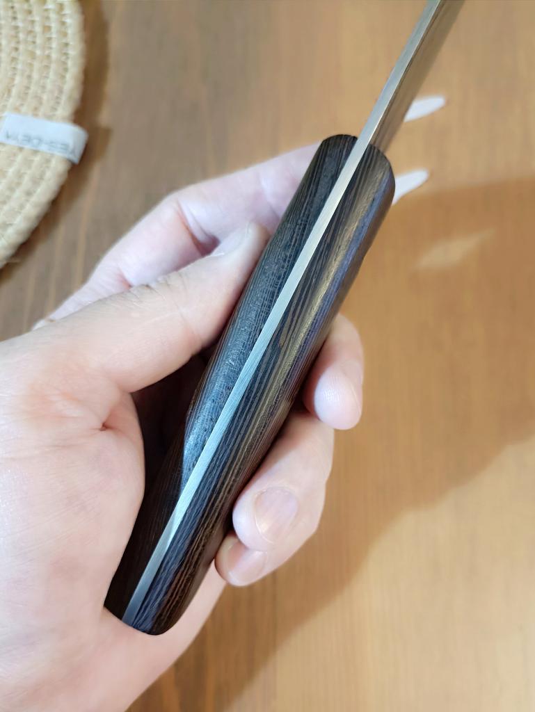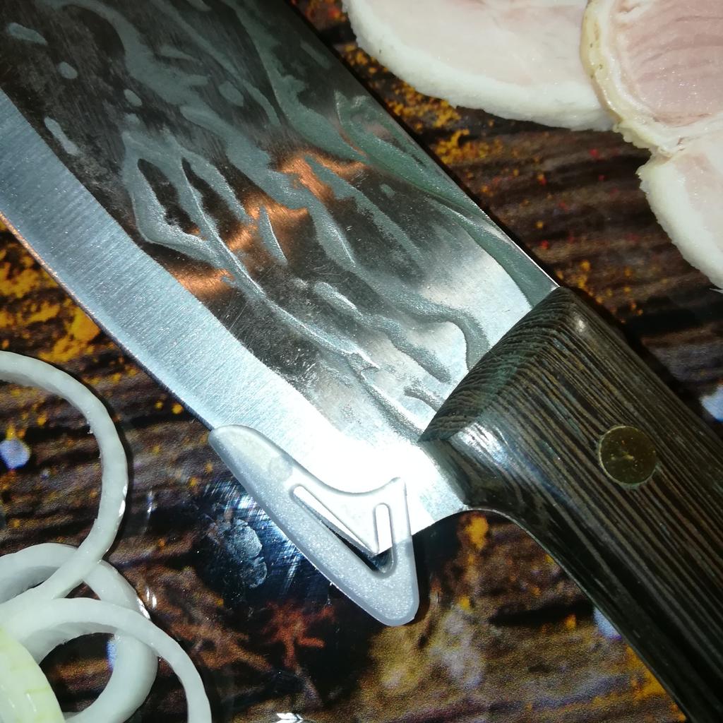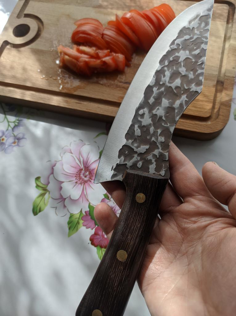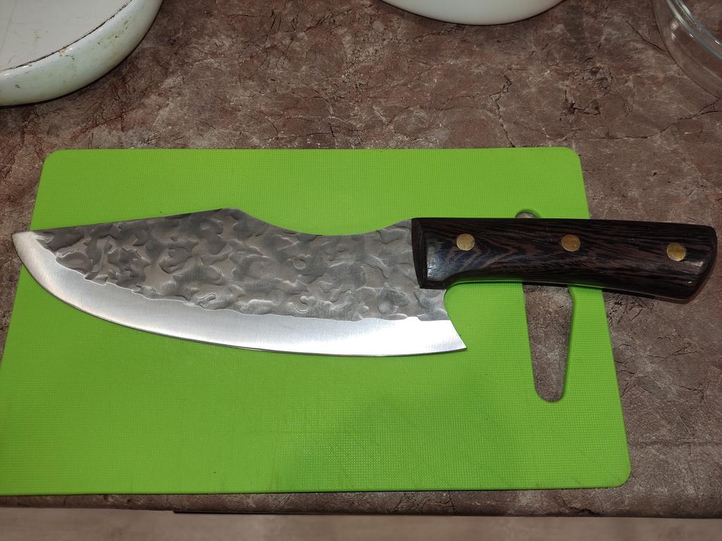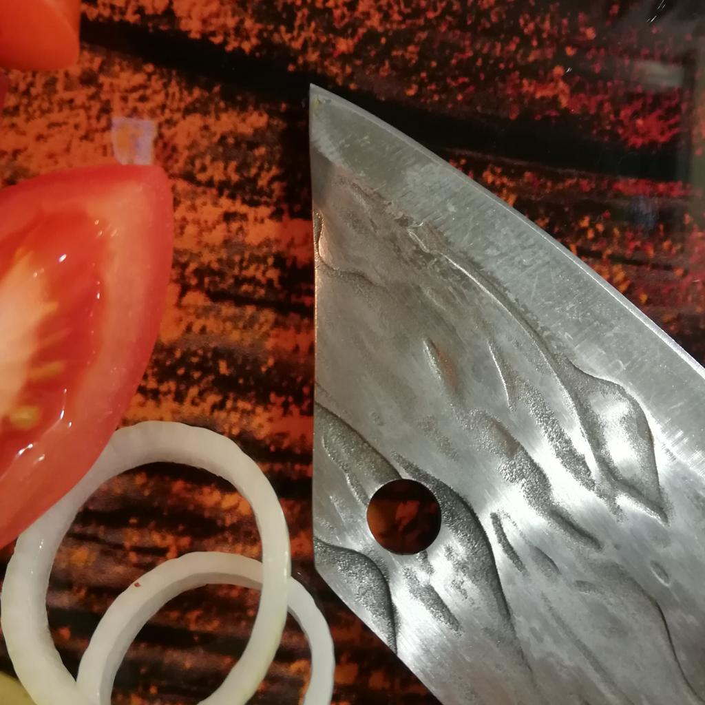 Ein Messer, das jede Küche braucht. Der Stahl ist super. Scharf, schneidet mühelos Papier, schneidet eine Tomate im Handumdrehen) Behandelte gefrorenes Hackfleisch ohne Probleme. Die Dicke des Stahls beträgt 2,5 mm.