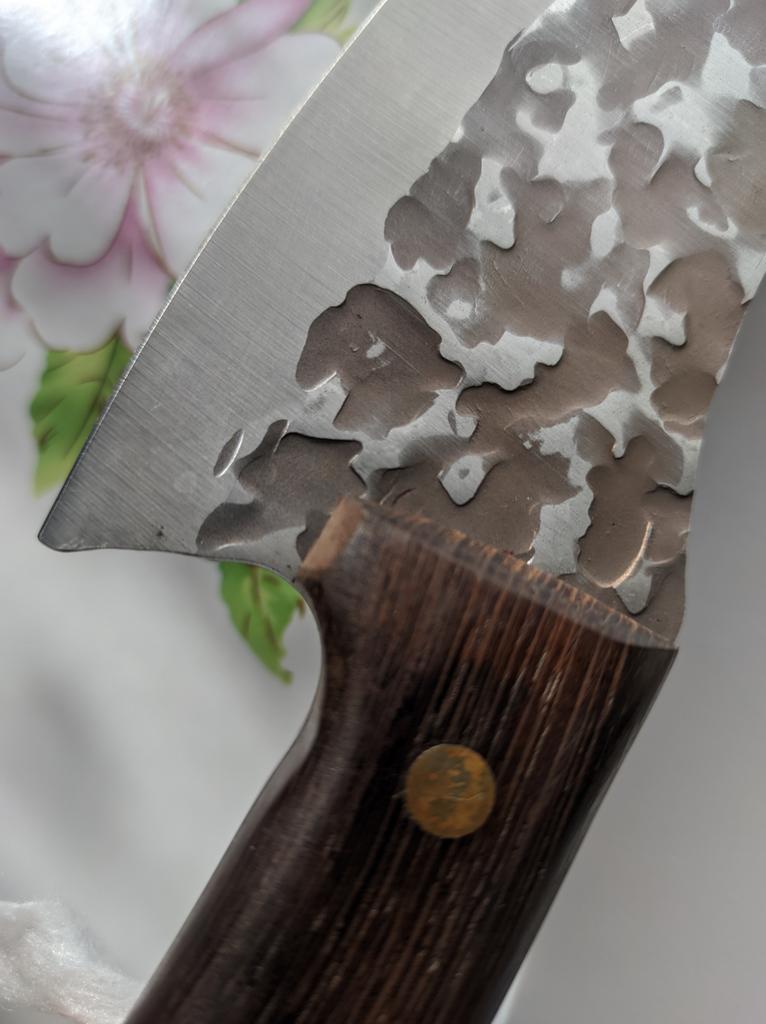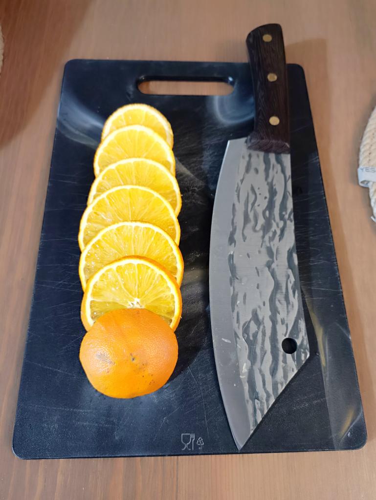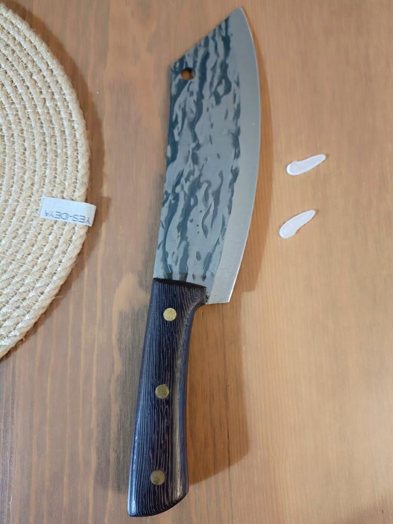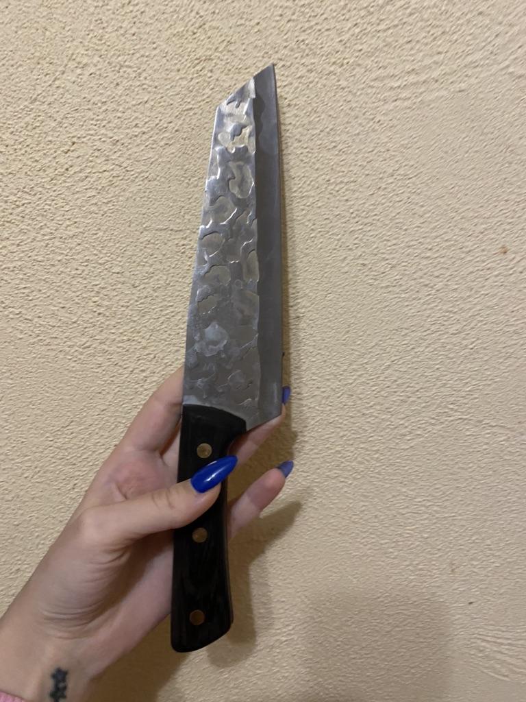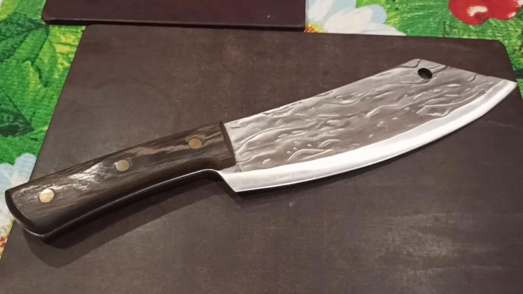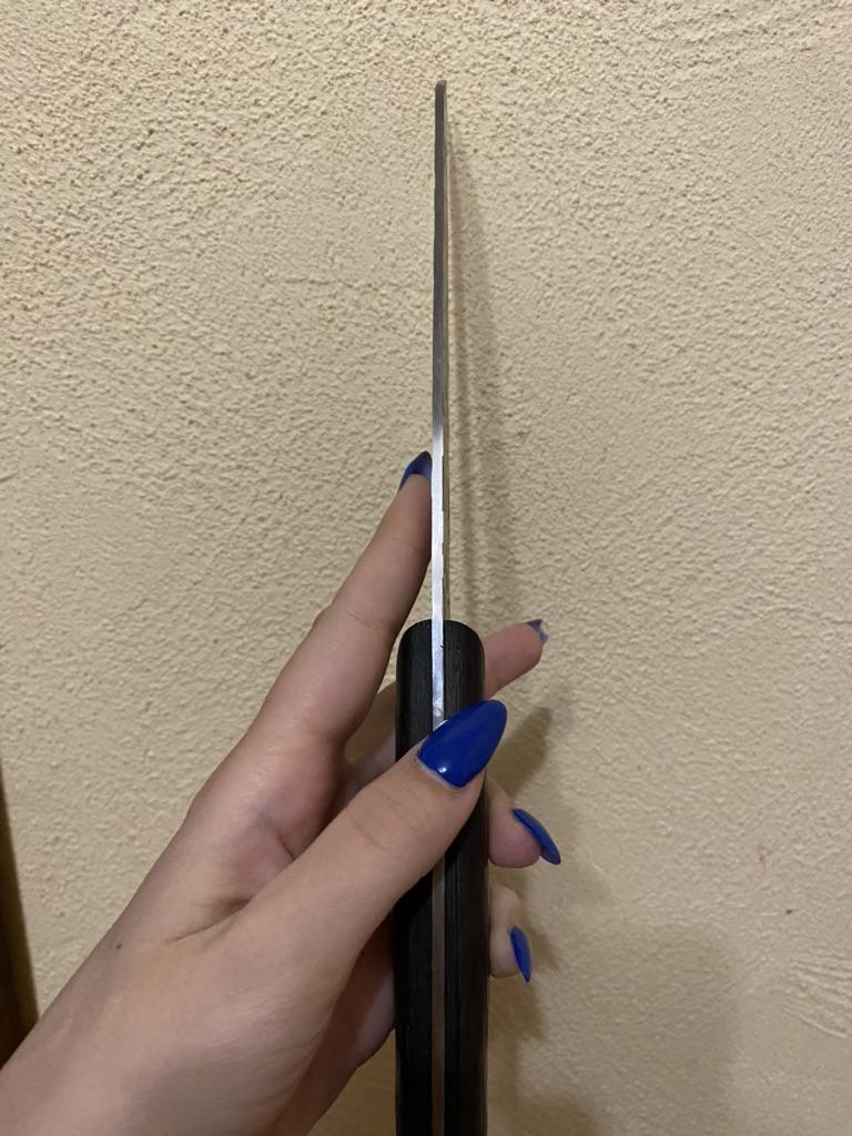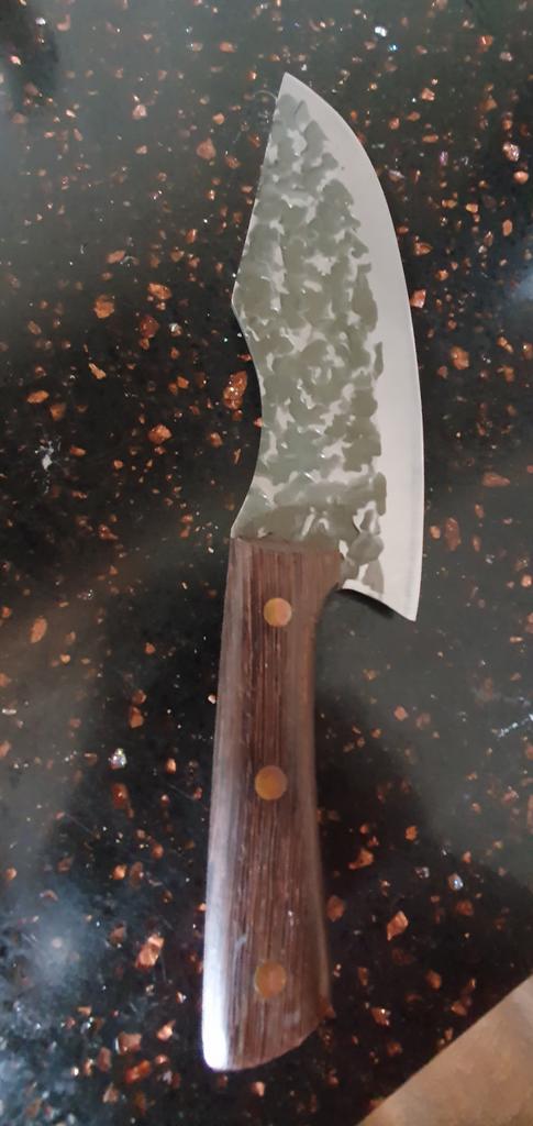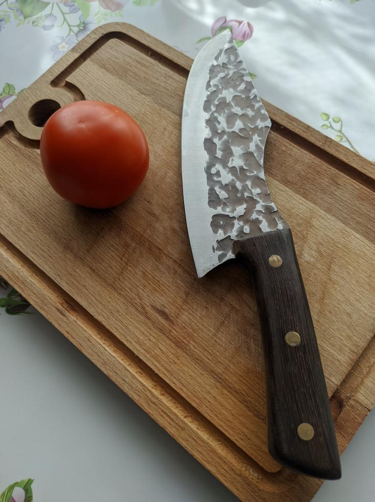 Ein Messer, das jede Küche braucht. Der Stahl ist super. Scharf, schneidet mühelos Papier, schneidet eine Tomate im Handumdrehen) Behandelte gefrorenes Hackfleisch ohne Probleme. Die Dicke des Stahls beträgt 2,5 mm.