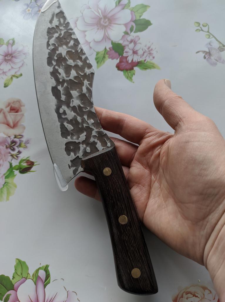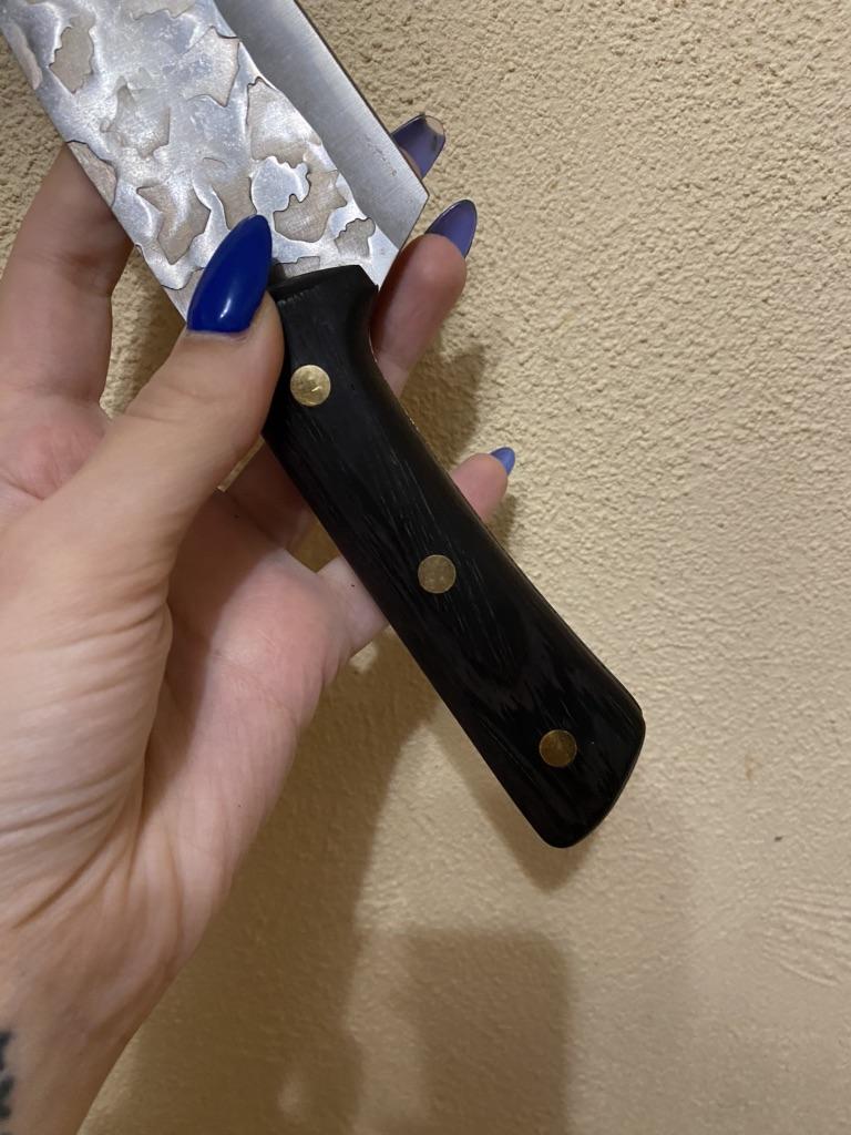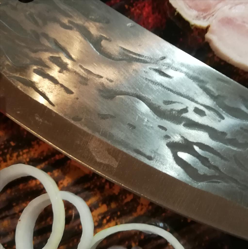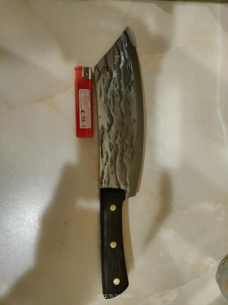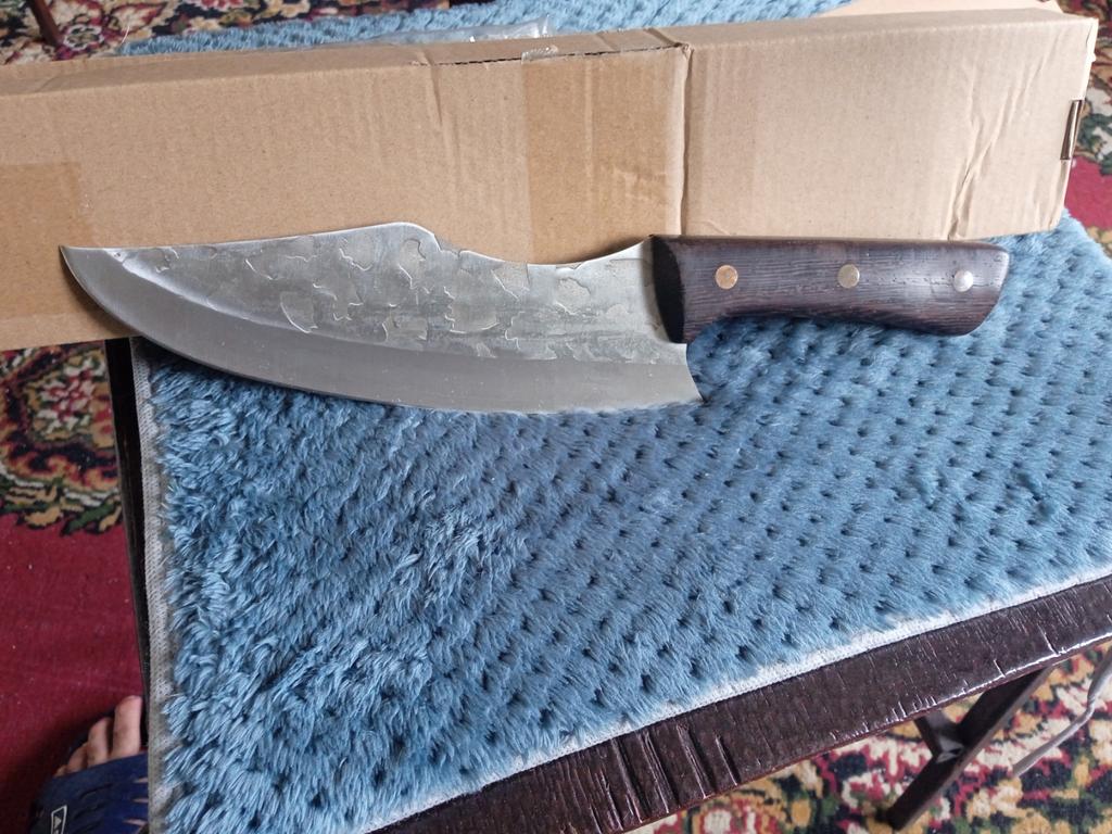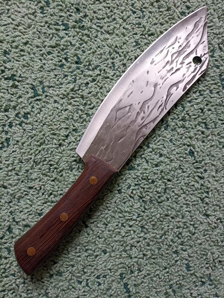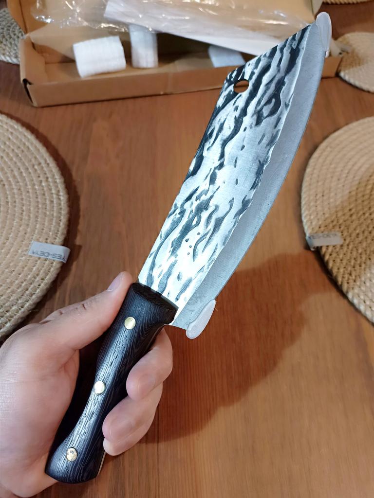 Ein Messer, das jede Küche braucht. Der Stahl ist super. Scharf, schneidet mühelos Papier, schneidet eine Tomate im Handumdrehen) Behandelte gefrorenes Hackfleisch ohne Probleme. Die Dicke des Stahls beträgt 2,5 mm.