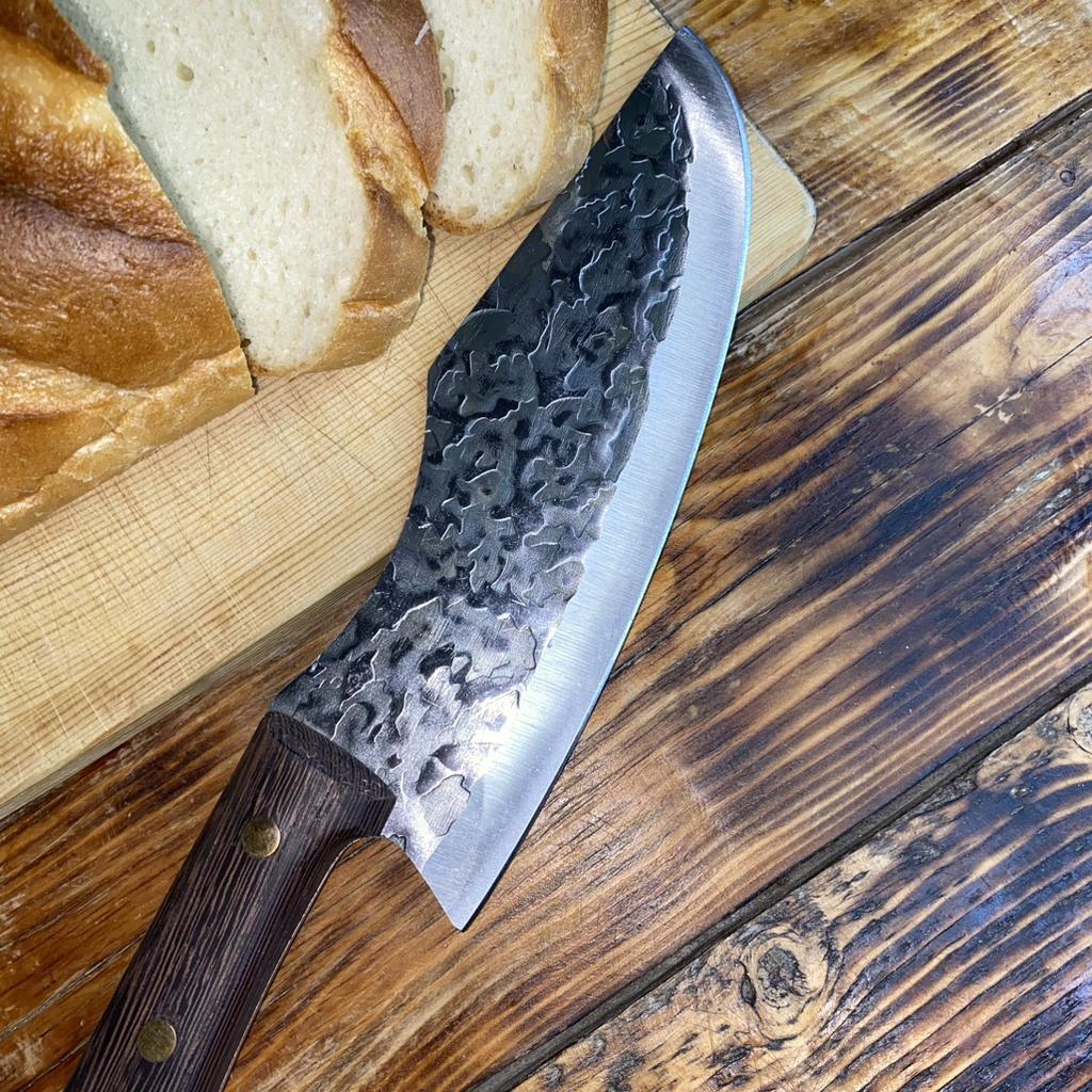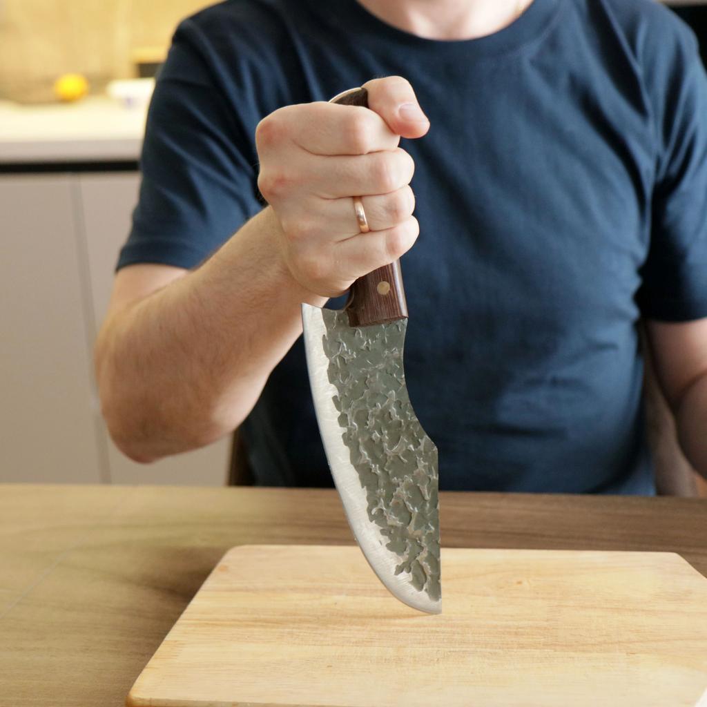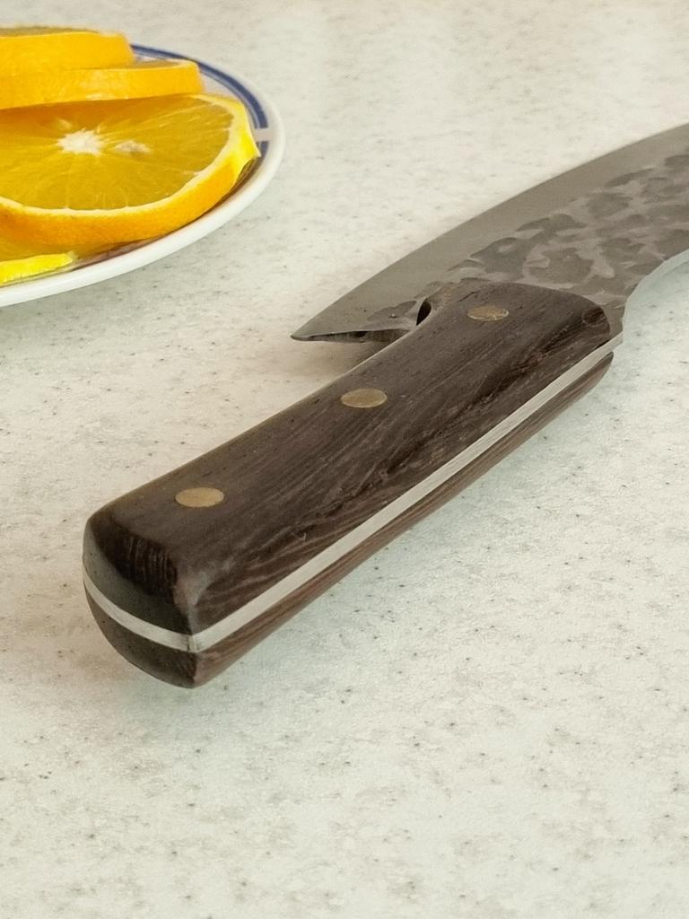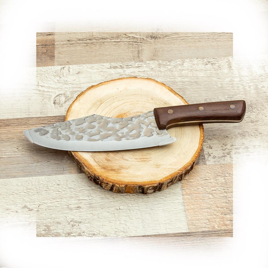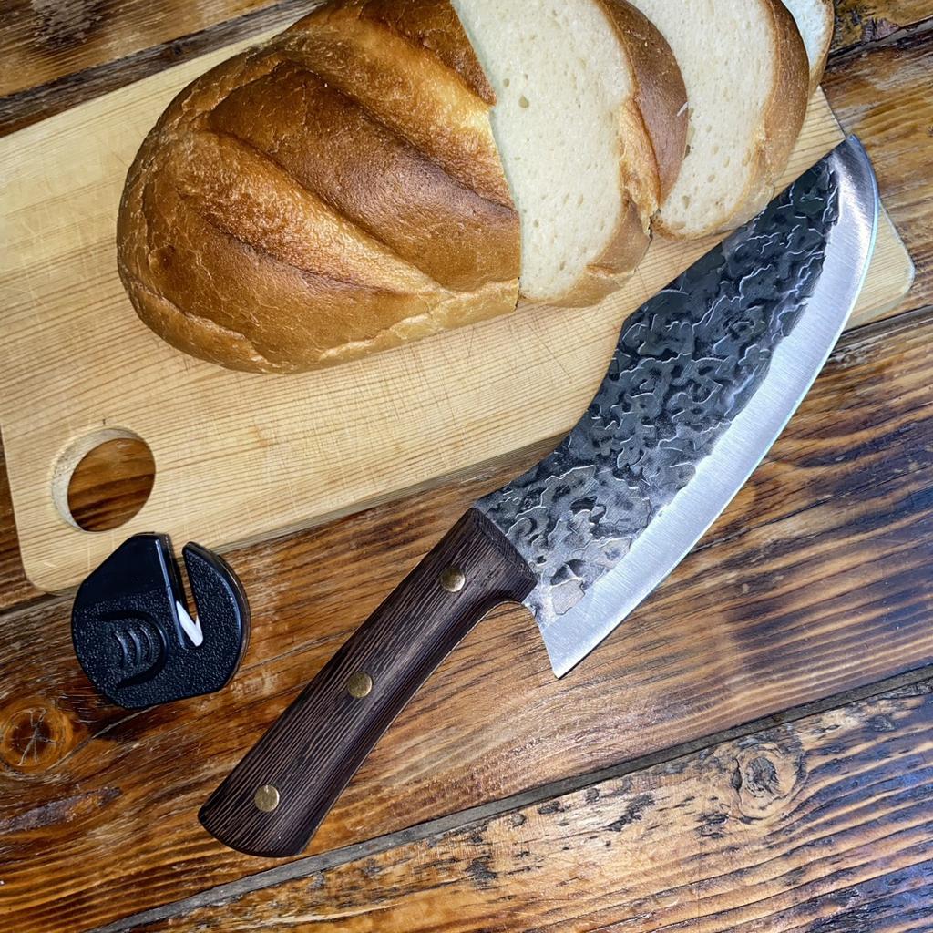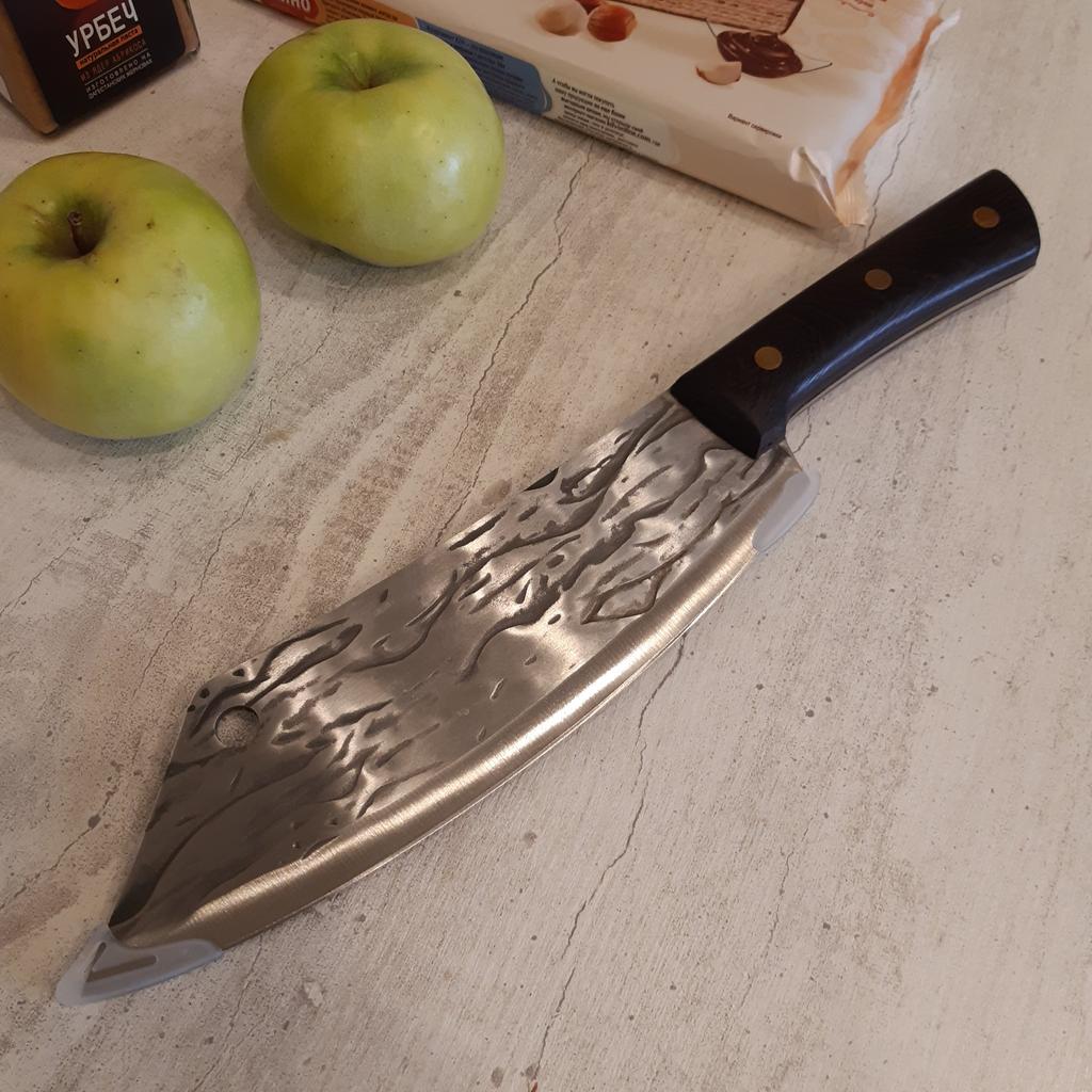 Ein Messer, das jede Küche braucht. Der Stahl ist super. Scharf, schneidet mühelos Papier, schneidet eine Tomate im Handumdrehen) Behandelte gefrorenes Hackfleisch ohne Probleme. Die Dicke des Stahls beträgt 2,5 mm.