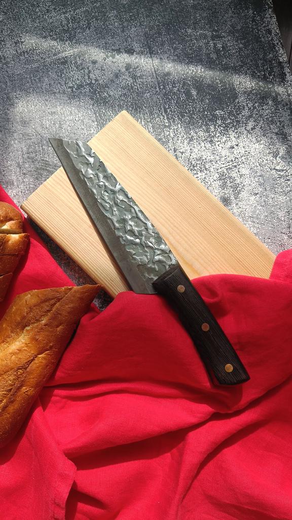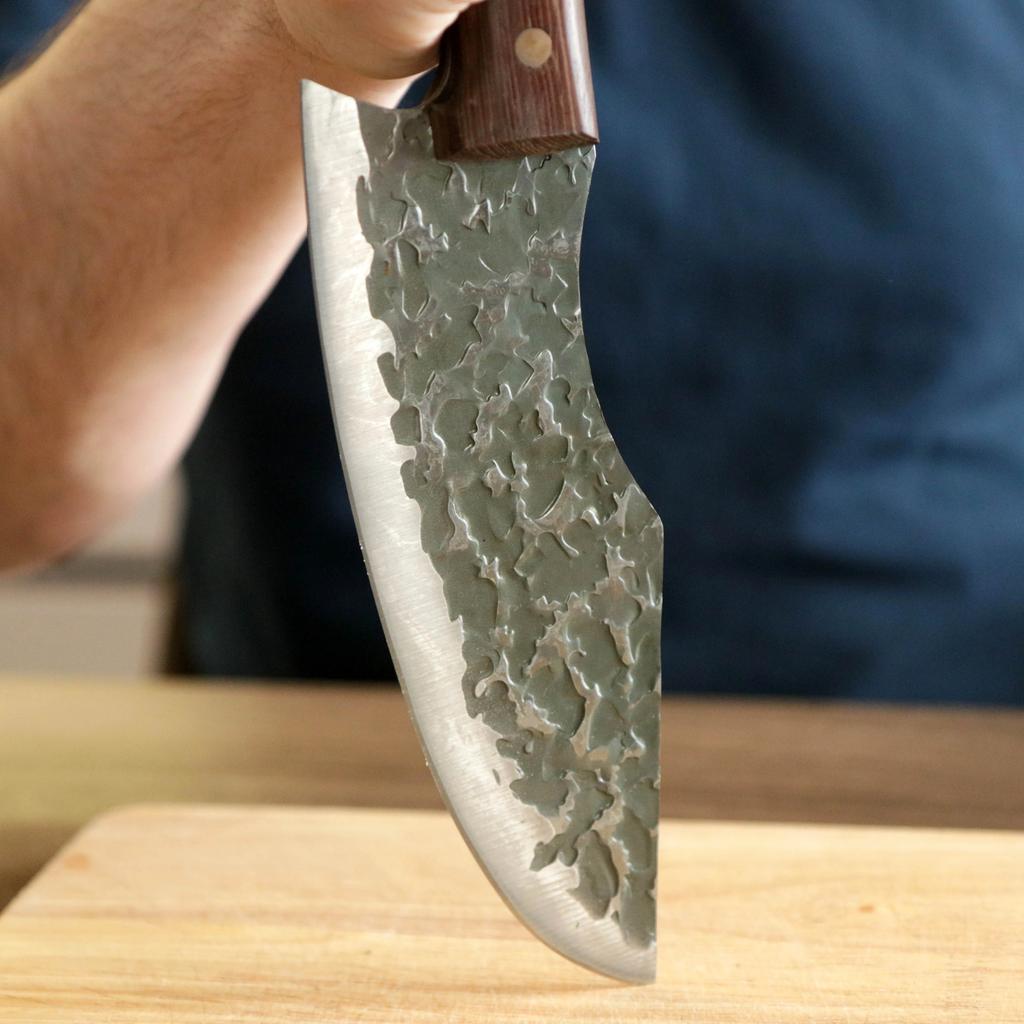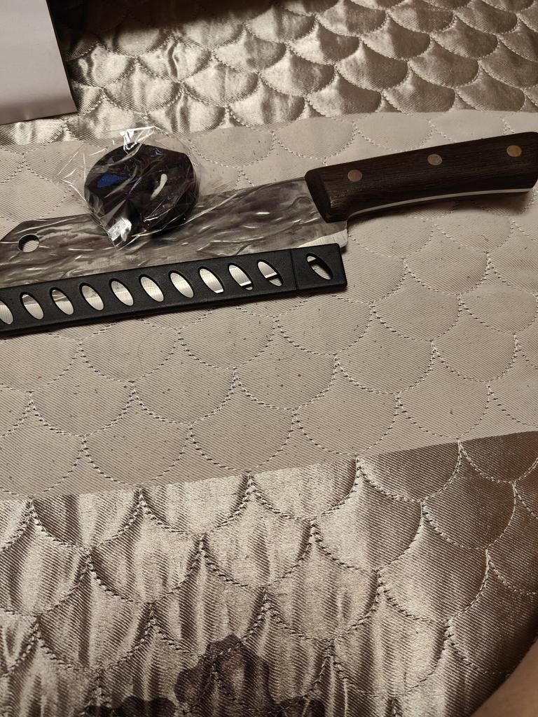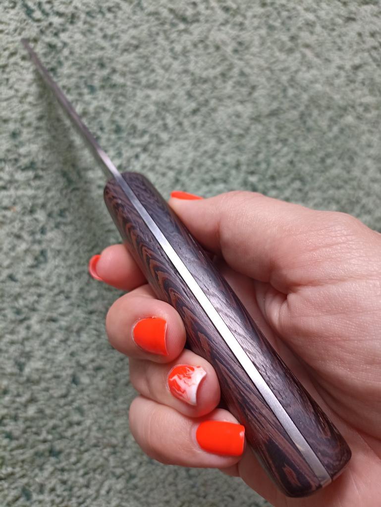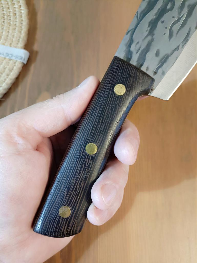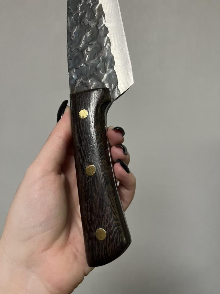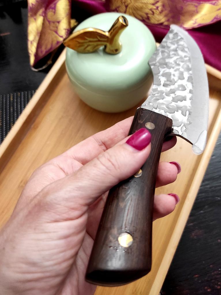 Ein Messer, das jede Küche braucht. Der Stahl ist super. Scharf, schneidet mühelos Papier, schneidet eine Tomate im Handumdrehen) Behandelte gefrorenes Hackfleisch ohne Probleme. Die Dicke des Stahls beträgt 2,5 mm.