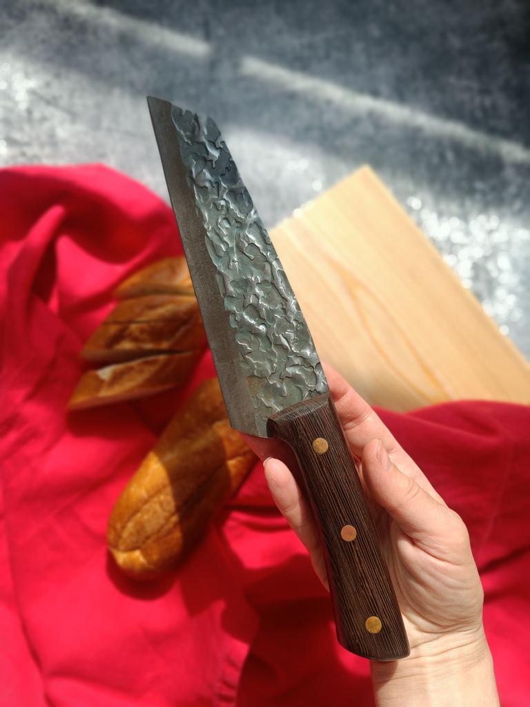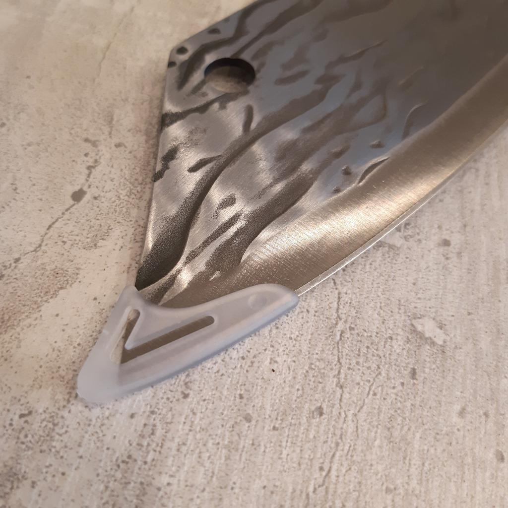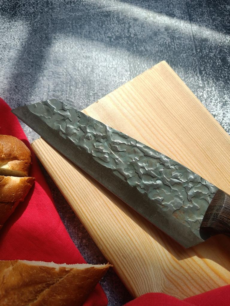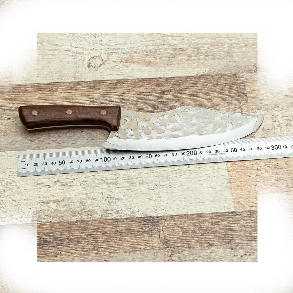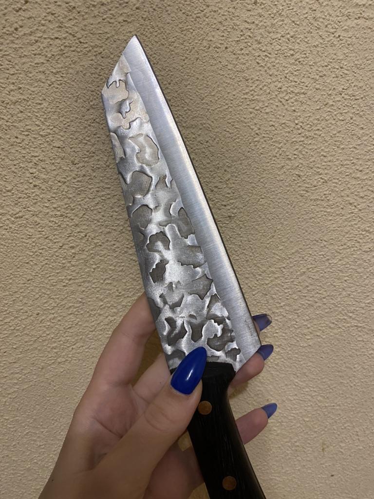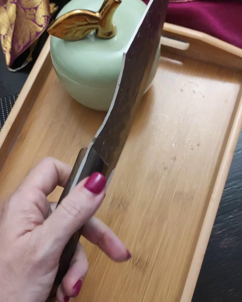 Ein Messer, das jede Küche braucht. Der Stahl ist super. Scharf, schneidet mühelos Papier, schneidet eine Tomate im Handumdrehen) Behandelte gefrorenes Hackfleisch ohne Probleme. Die Dicke des Stahls beträgt 2,5 mm.