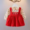 Frühling Herbst Infant Baby Mädchen Kleider Casual Große Ohr Tasche Gefälschte Zwei-stück Hosenträger Kleid Druck Kleidung