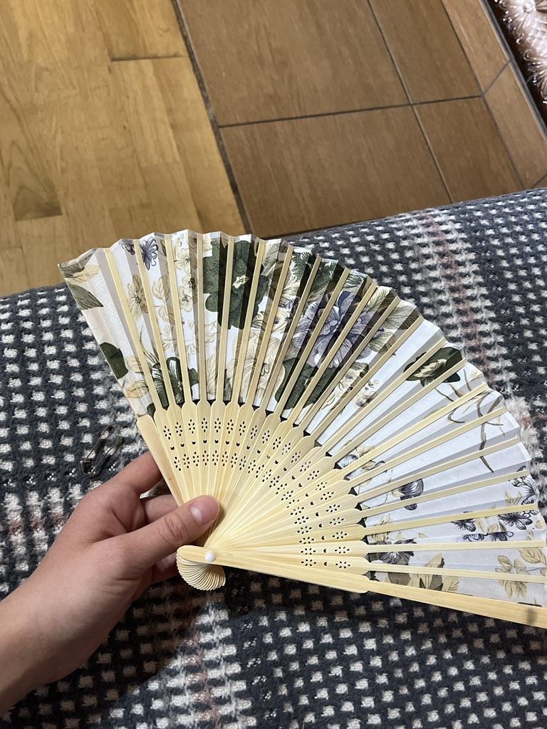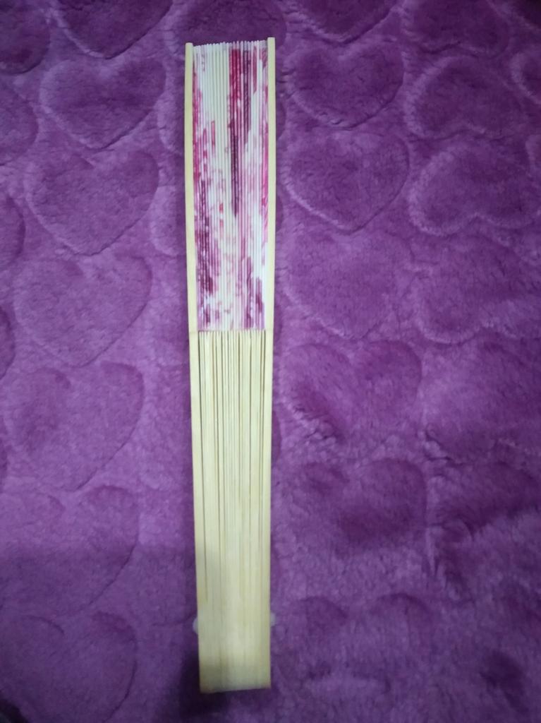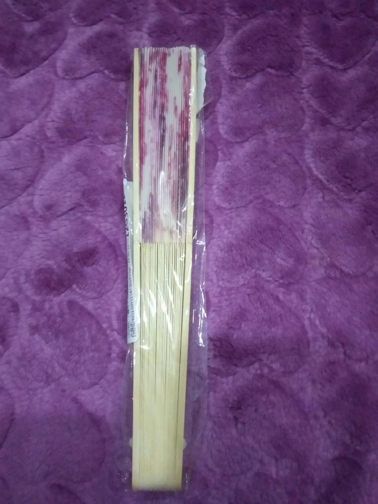 Fächer aus Holz. Ich verstehe die Materialien nicht, es sieht aus wie dicker Papierstoff. Es gibt auch einen Papierhalter, damit er sich nicht versehentlich öffnet. Das Design und die Gravur sind wunderschön. 😊 Mir ist ein kleiner Fleck aufgefallen, wahrscheinlich werden nicht alle Fans so sein, aber nur damit du es weißt. Es ist mir egal