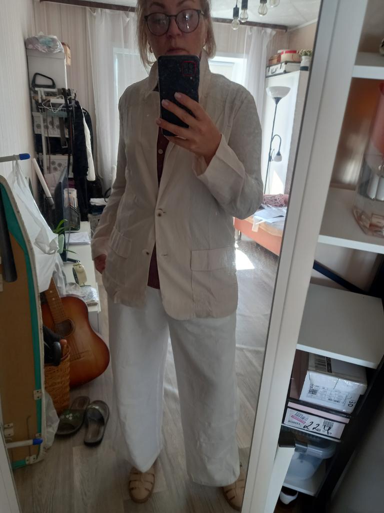 Der Leinenblazer passt perfekt in der Farbe und Grösse . Habe ihn extra in Größe L bestellt. Normalerweise trage ich so M. Ist etwas dünn, aber für einen etwas kühleren Tag im Sommer passt er sehr gut. Oder wärmeren Herbsttag. Er ist etwas knittrig und ich muss ihn wohl oft bügeln. Aber sonst finde ich ihn sehr schön!