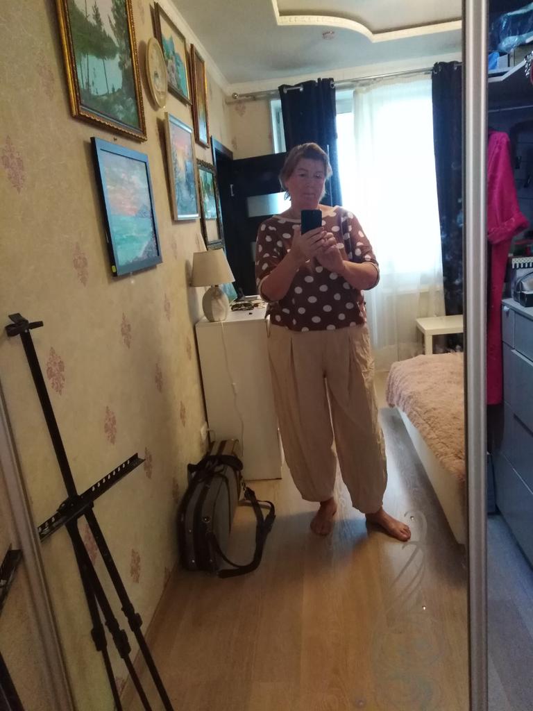 Schicke Hose! Größe XL - für unsere 50-52. Locker, weit, wie ich es wollte. Baumwolle. Interessanter Schnitt. Farbe entspricht.