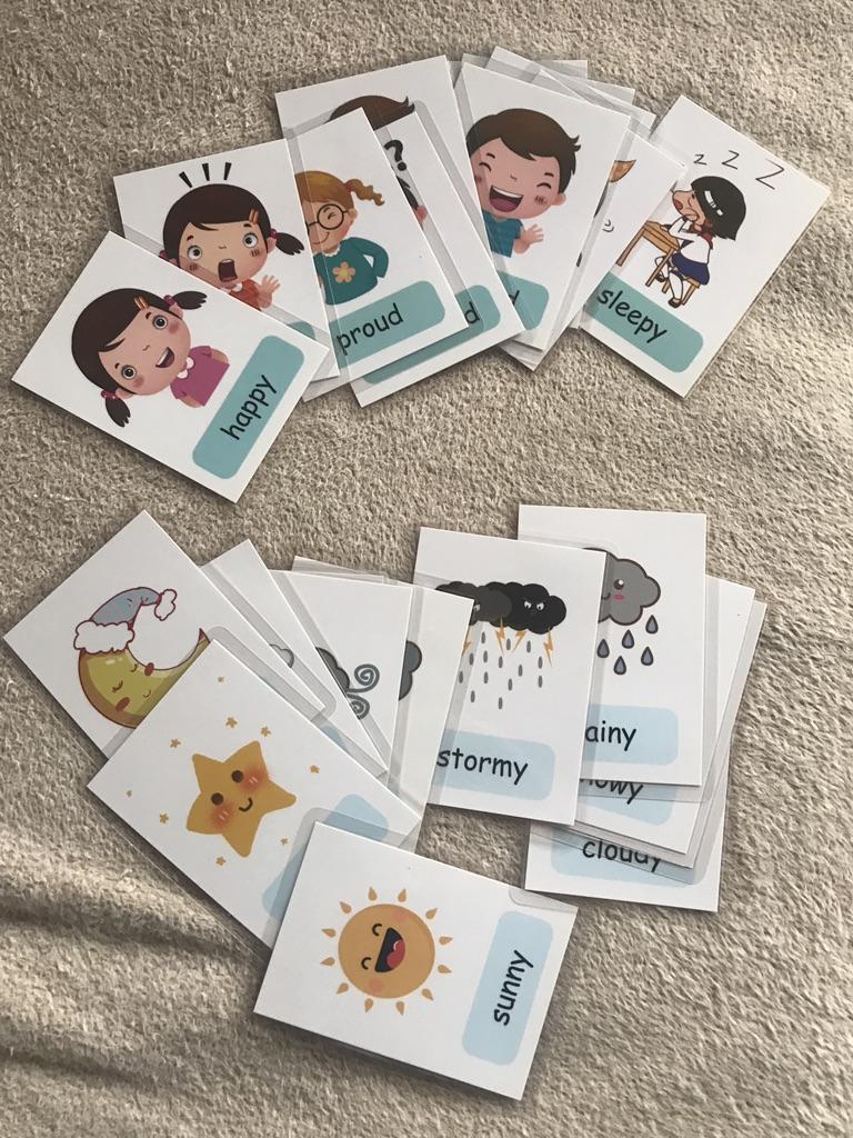 12 Stück 80 x 110 mm Montessori-Baby-Emotions-Lernkarte, Cartoon-Englisch-Emotions-Flash-Karten für Kinder, lustiges Gedächtnis-Übungsspiel