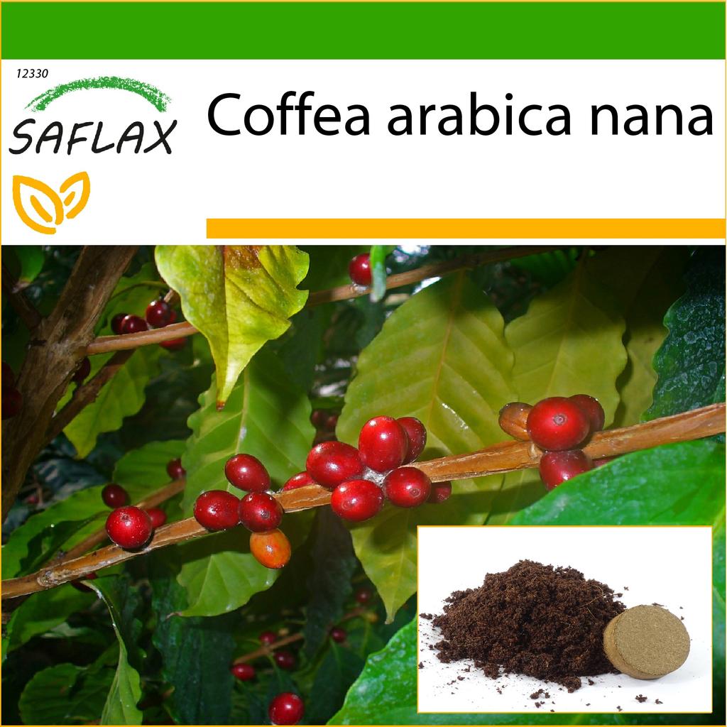 Dwarf Coffee wächst am Anfang einen Stängel und wird mit der Zeit buschiger. Im Topf oder Kübel gehalten, kann sie bis zu 1,50 Meter hoch werden. Seine gegenüberliegenden Blätter sind dunkelgrün gefärbt und glänzend. Nach mindestens drei Jahren – beim Zwergkaffee bei einer Höhe von 40 bis 50 cm – bringt er weiße und nach Vanille duftende Blüten hervor. Die danach erscheinenden Früchte (Kaffeekirschen) sind zunächst grün, werden dann rot und später schwarz. Jede Frucht enthält normalerweise zwei Bohnen.