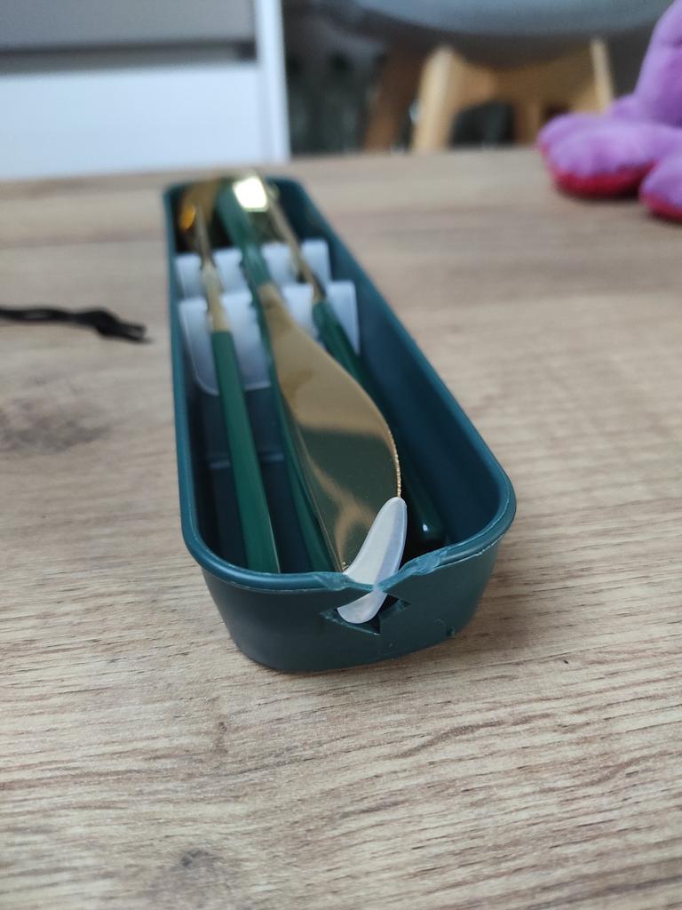 Alles wäre großartig, wenn es nicht beschädigt und unvollständig wäre. Die Tasche hat keinen Verschluss, die Schachtel ist kaputt und das Messer ist zerkratzt.