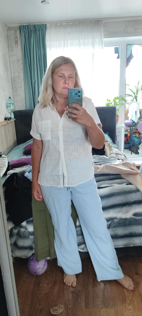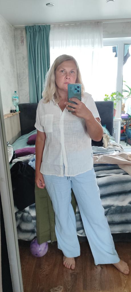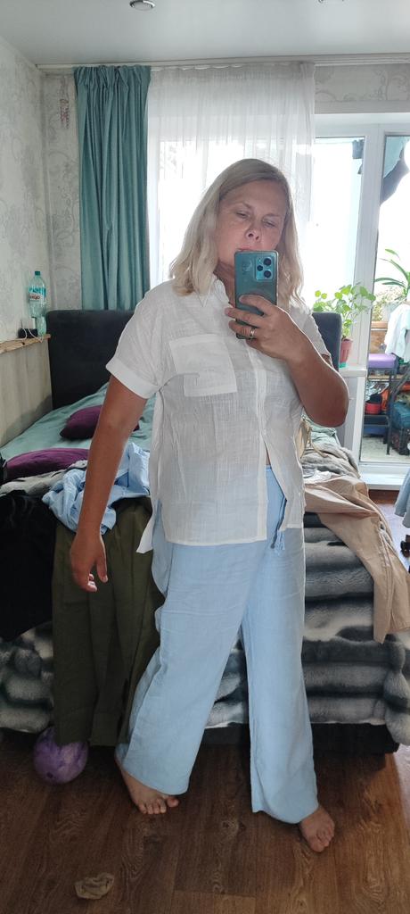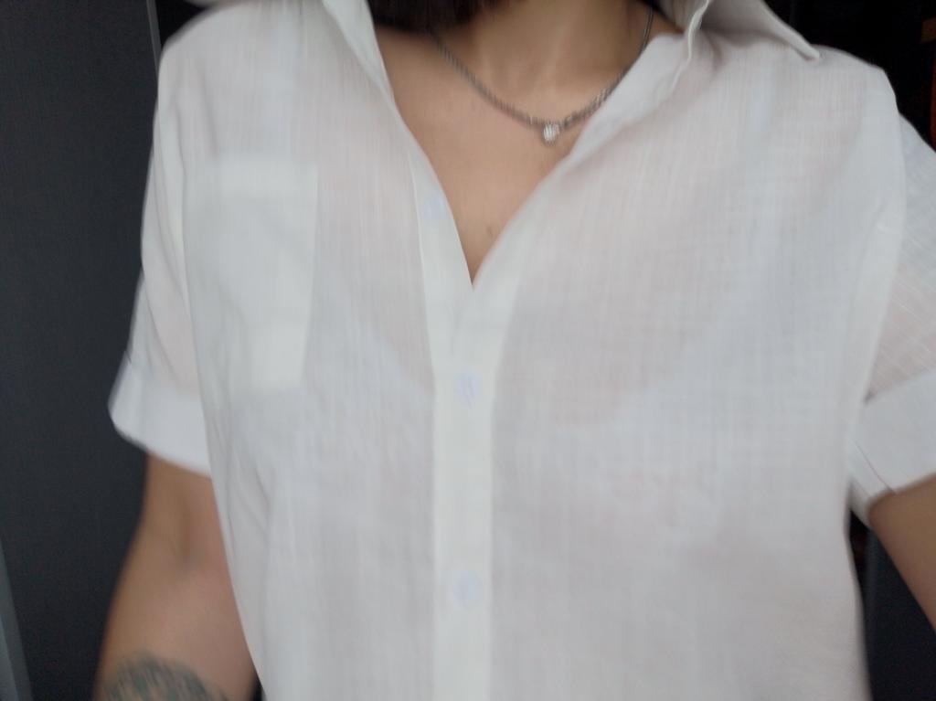 Angenehmer Stoff, etwas zu groß, aber ich werde ihn tragen. Ich wollte genau so eine Bluse und die Farbe hat gepasst.