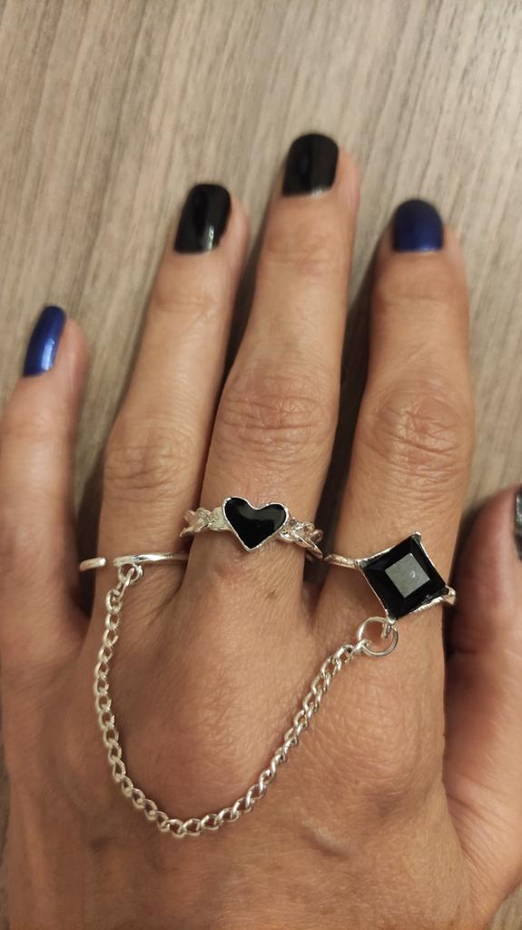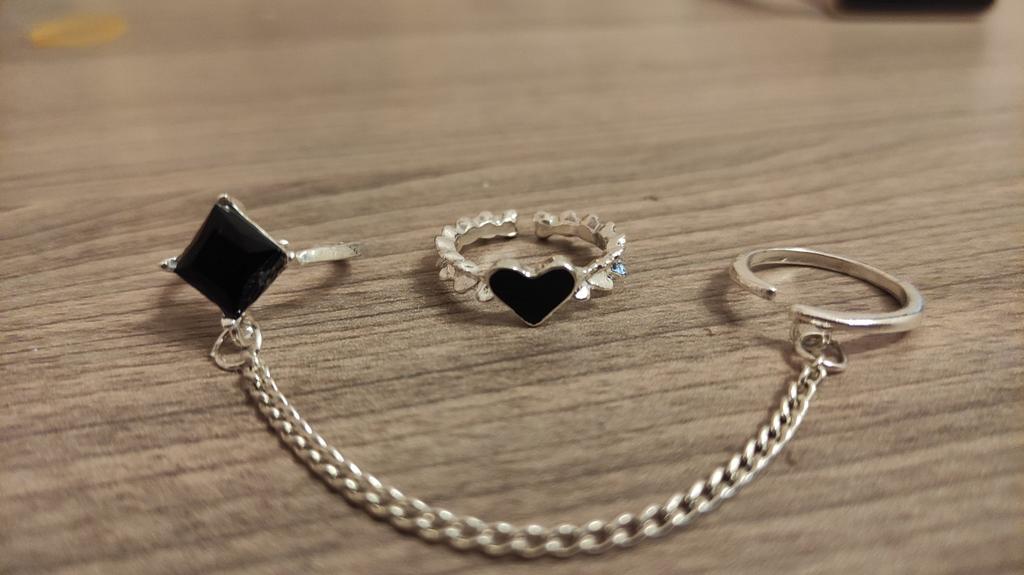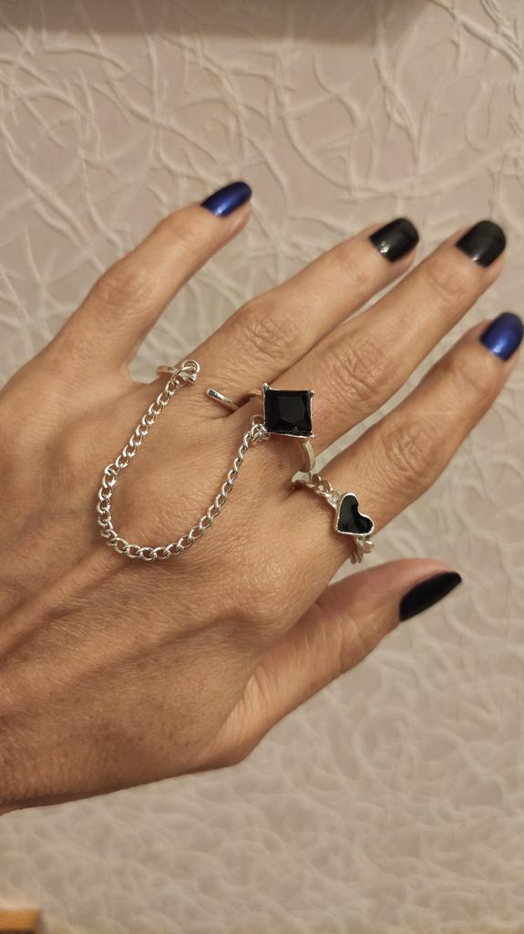 Set aus drei Ringen. Die beiden sind durch eine Kette verbunden. Wie man sieht, sieht es billig aus, die Steine sind schief aufgeklebt, aber wenn man nicht genau hinschaut, funktionieren sie zur Abwechslung mal.