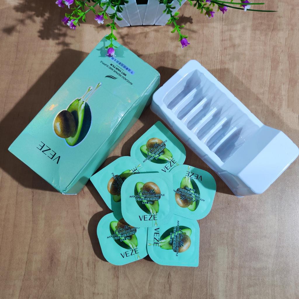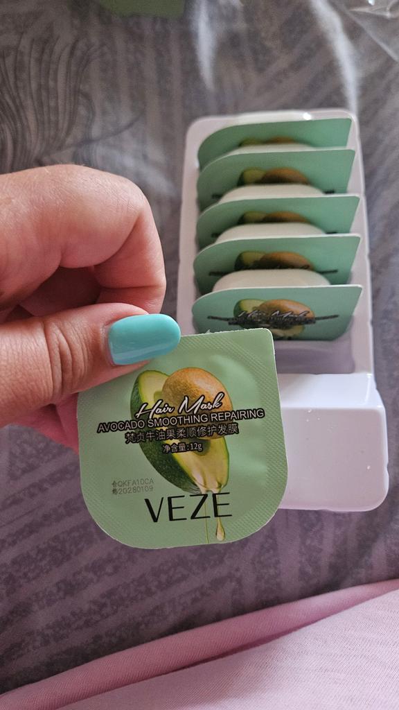 Haarmaske mit Avocadoöl, nur 6 Stück in einer Packung, aber es reicht mir lange, meine Haare sind kurz, aber dick, ich habe es ausprobiert, es ist ein ausgezeichnetes Produkt, spendet Feuchtigkeit, macht weich, verleiht Glanz, damit sie Verstehen Sie, ich bin eine gebleichte Blondine, ich kämme nicht ohne Maske, aber die Haare sind leicht, weich und kämmbar