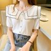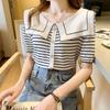 Frauen Sommer Sweety Navy Kragen Strickpullover T-Shirt Tops Kurzarm Knopf Volltonfarbe Gestreift Lose Weiß